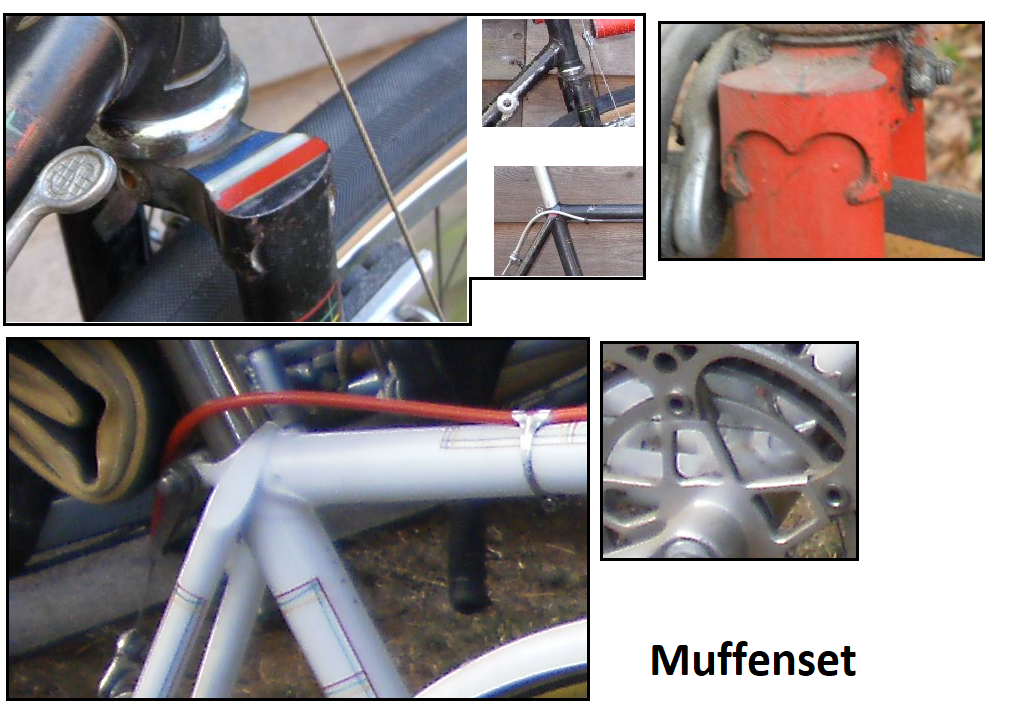 Kommen wir zum allgemeinen Muffenset, gerade Muffen sind scheinbar ziemlich Zeit, Model und Qualität abhängig, viele Hersteller haben je nach Model und Jahrgang eine Vielzahl verschiedener Muffen verwendet. was die höherwertigen Alleluia Räder betrifft die ich gefunden habe, haben sie zumindest ähnliche Lugset Kombinationen. So werden öfter Vagner Gabelköpfe verwendet, das schwarze Randonneur und der weiße Renner (Gesamtfotos folgen noch) welche meinem Rad insgesamt am stärksten ähneln habe wie es aussieht auch die selbe Sattelstreben Verbindung, das weiße hat sogar die selbe Prugnat Muffe und eine Tretlagermuffe die von dem bisschen was man sieht genau meiner RGF Muffe zu entsprechen scheint.
