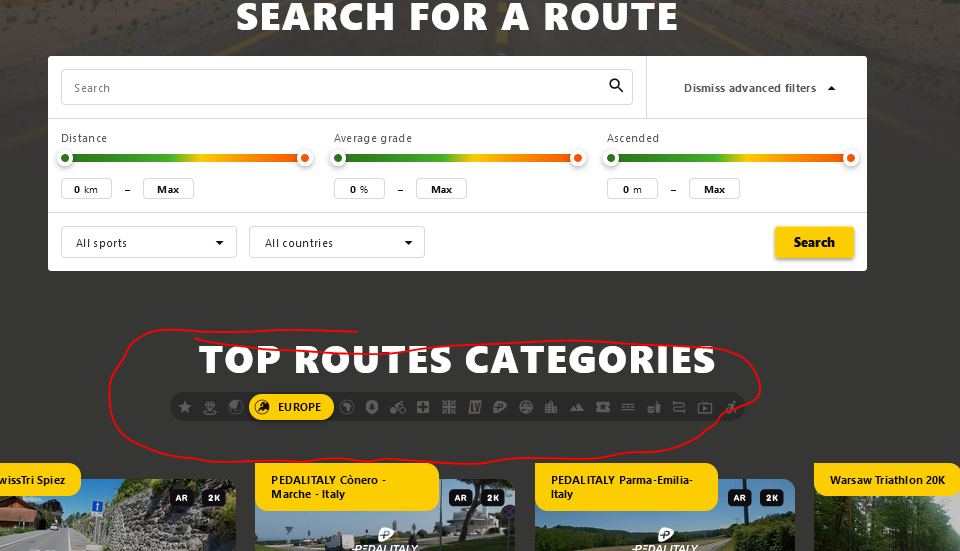 Weiss jemand wie man vernünftig nach Routen sucht? Letztes Jahr gab es noch eine Suche mit diversen Parametern, u.a. Land und AR-Verfügbarkeit. Die war zwar etwas umständlich und die Kartenversion auch ziemlich langsam, aber man hat gefunden wonach man suchte. Aktuell finde ich nur noch diese hier, welche meines Erachtens ziemlich nutzlos ist. Wenigstens nur nach AR-Routen (gemäss Rouvy sind nur diese auch für Workouts verfügbar) suchen sollte man können.