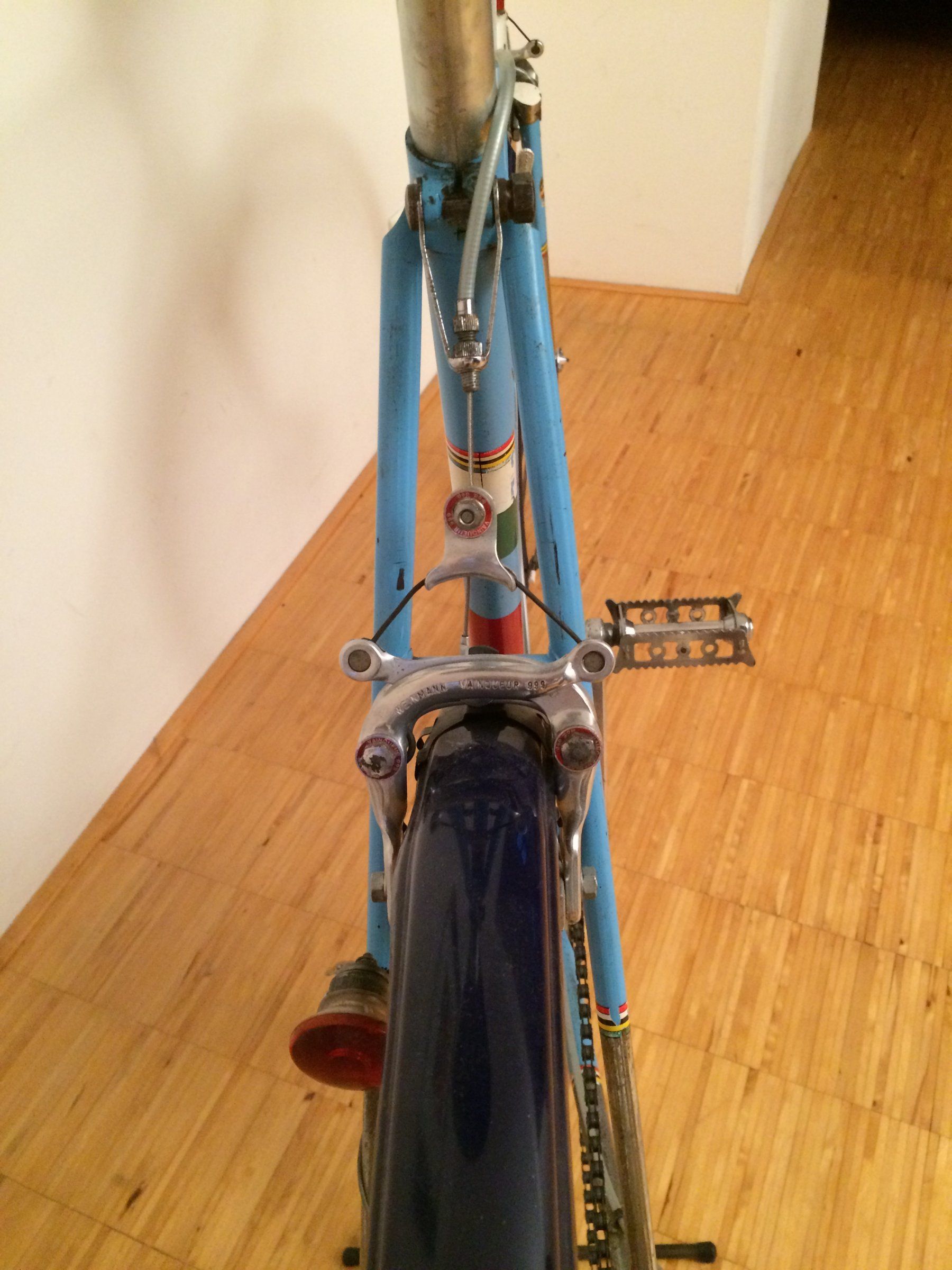 Gekauft habe ich das Fahrrad teuer über eine bekannte Internet-Plattform, um dann zunächst vor Ort in der Nähe von Do - immerhin verbunden mit einem Verwandtschaftsbesuch, weil meine Frau aus der Ecke stammt - vom Verkauf zurückzutreten: Verbaut war hinten statt des versprochenen Campa-Schaltwerks ein Huret Svelto und vor allem war die Gabel verzogen (VR hing "krumm"). Dann vor Ort doch noch nach langem Hin und Her (und Zureden meiner Frau, die das Fahrrad einfach nur schön fand) Einigung auf erheblichen Preisnachlass, so dass der Preis jetzt ok und nur das Problem mit der Gabel blieb. Fahrrad auseinander- und wieder zusammengebaut (Ergänzt habe ich das Campa Gran Sport Schaltwerk, damit es zum vorhandenen Umwerfer passt, zeitlich passende Lyotard-Pedale sowie später noch den