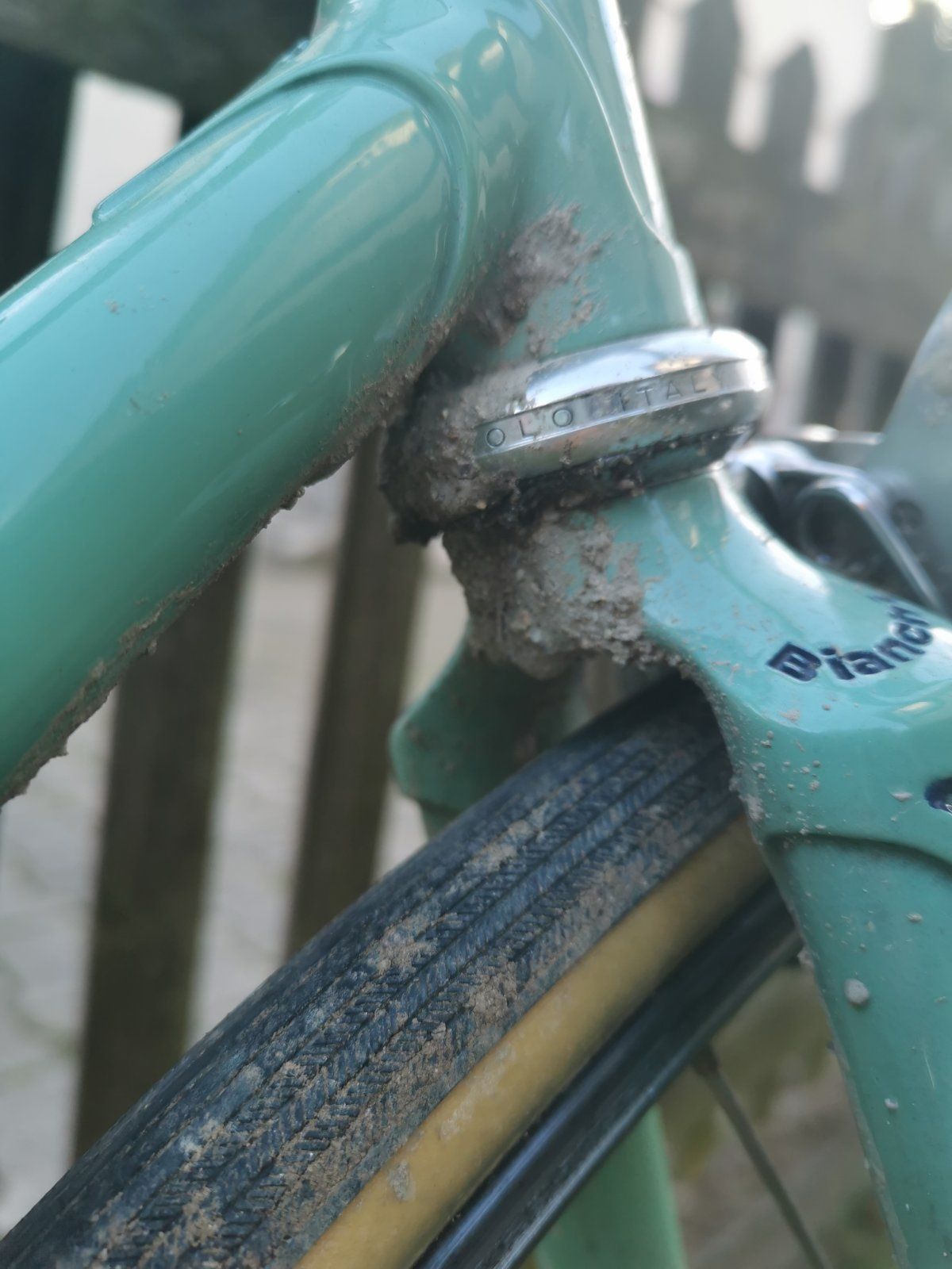 Ein kleines bisschen dreckig ist mein Rad auch geworden. in den Senken stand oft noch etwas Wasser auf den strade bianche. Den bekomm ich bestimmt ab. Schlimmer ist der Sattel. Da hoffe ich, dass das mit Lederseife weg geht und nicht die Farbe angegriffen wird. Die celestefarbenen Turbos sind ja viel seltener als Super Turbos. Das Ding war quasi neu.