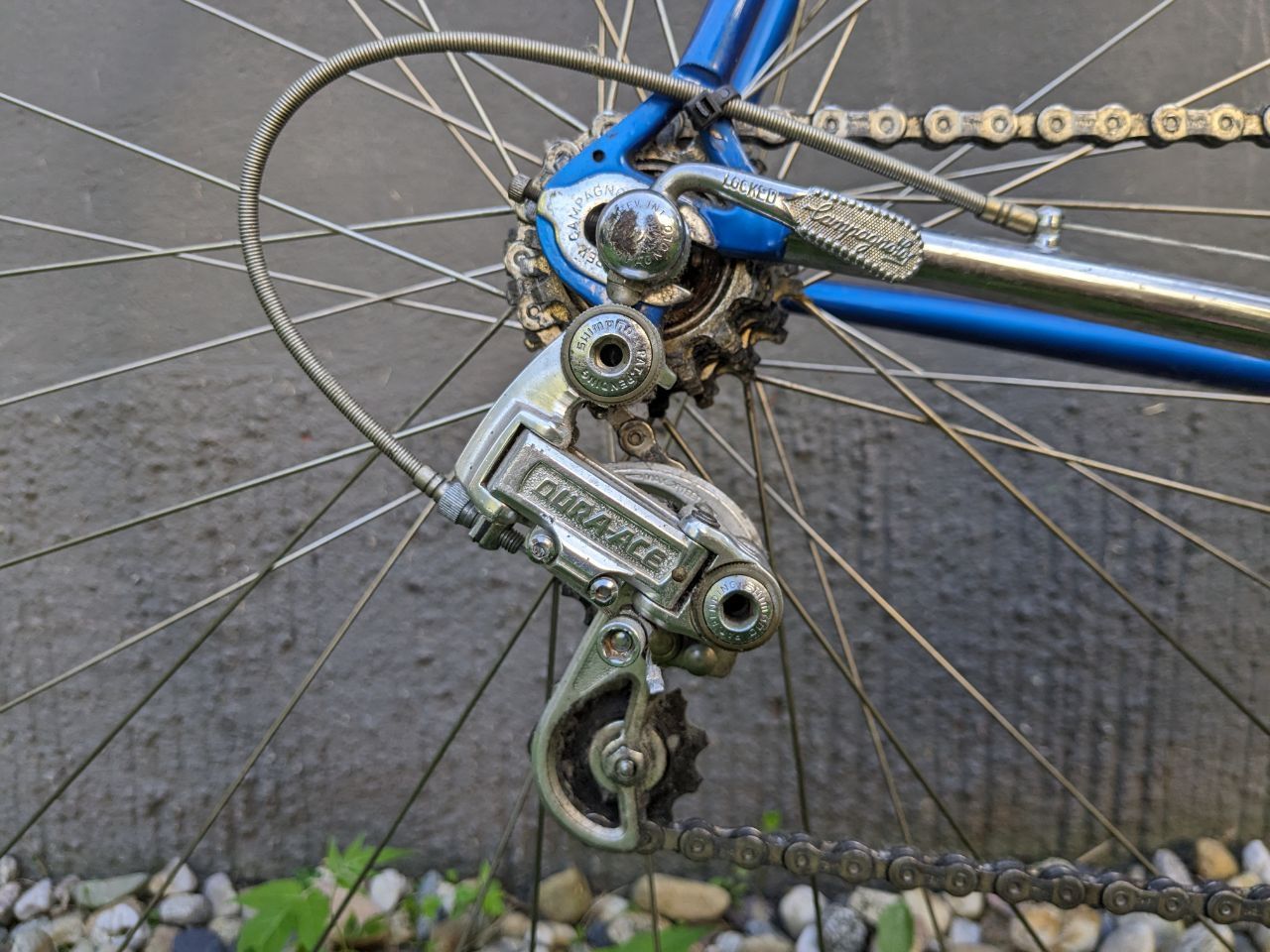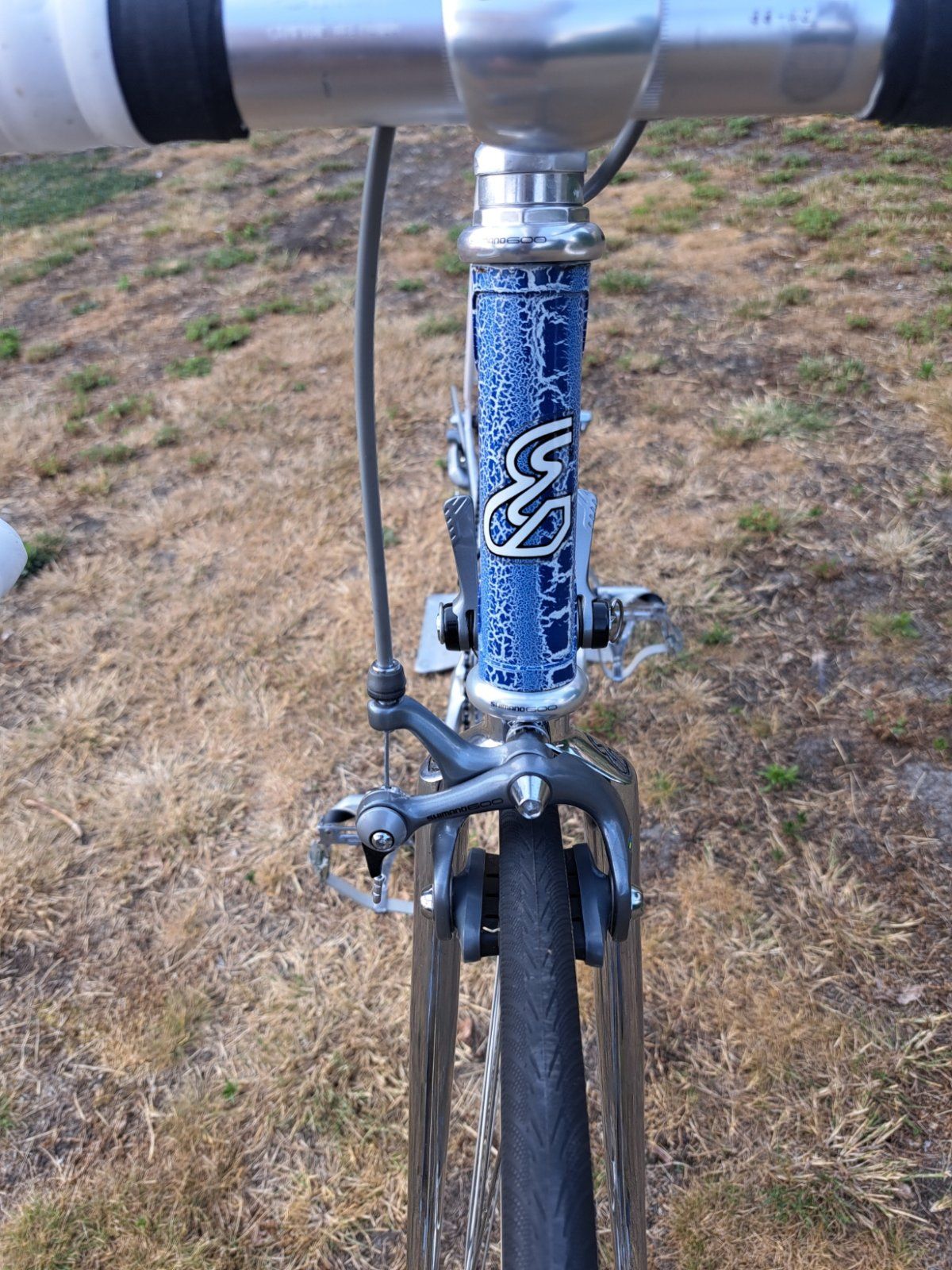 Laufräder mit Schlauchreifen zum Aufkleben sind leider auch nicht mehr sehr beliebt. Früher haben wir die Leute mit Clinchern ausgelacht, heute fahren wir sie selber. Auch der Cinelli 66-42 ist bei uns alten Leuten mit "Rücken" nicht mehr sonderlich beliebt, da er so extrem viel Drop hat. Natürlich kann man die Laufbahnen des Steuersatzes (der im übrigen ein schwarzer DA 7100 aus Stahl ist und nicht der spätere DA 7200 aus Alu zu dem man die Spezialschlüssel braucht) und des Innenlagers mit der seltenen 107 mm Achse nicht sehen.