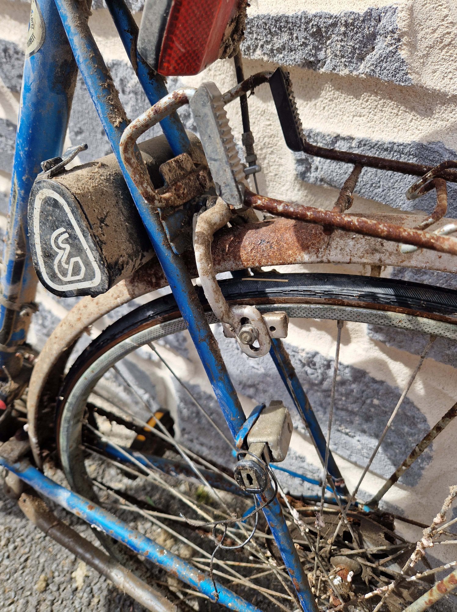 Zur Geschichte des Fahrrads: Es wurde meinem Mann geschenkt, als er etwa 8–10 Jahre alt war (er ist Jahrgang 1973). Es hat nie im Regen gestanden, aber es war in einem kleinen, etwas feuchten Raum gelagert, wo auch Katzen unterwegs waren – die haben leider den Chrom an einigen Stellen beschädigt.