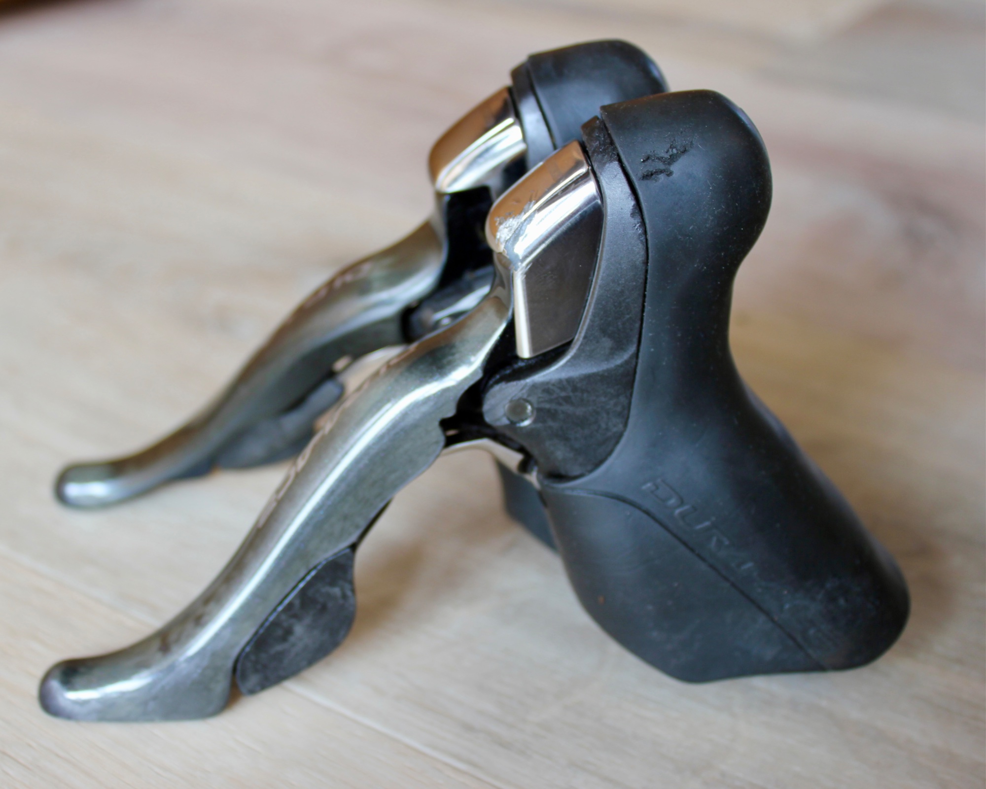 Mit der 7900er DuraAce kamen nun auch erstmals SHIMANO-Fahrer in den Genuß des freien, ungehinderten Blickes auf das Vorderrad. Das war… fast revolutionär. Ich kann mich noch sehr gut erinnern, wie ich mich jedesmal erschrak als ich während der Fahrt mit diesen STI ohne optische Unterbrechung auf das Vorderrad schaute… das war, als fehle da auf einmal das Auffangnetz.