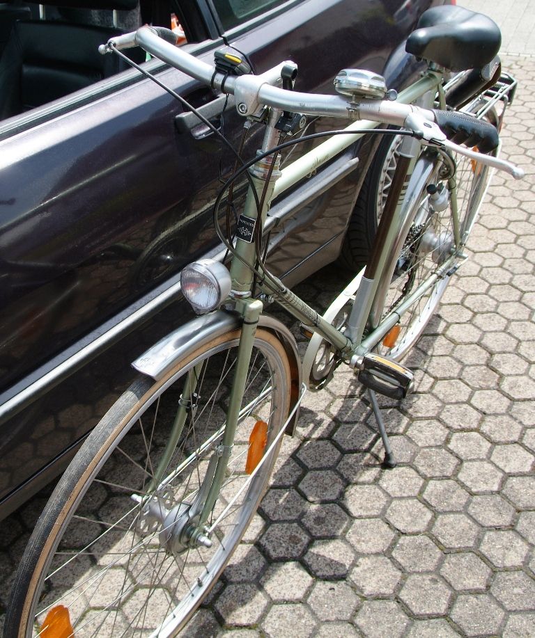 Aber eine interessante Schaltung (Sachs Commander), eine geschmiedete Alu-Kurbel, Alufelgen, Trommelbremsen, Edelstahlschutzbleche und ein scheinbar stabiler Gepäckträger.