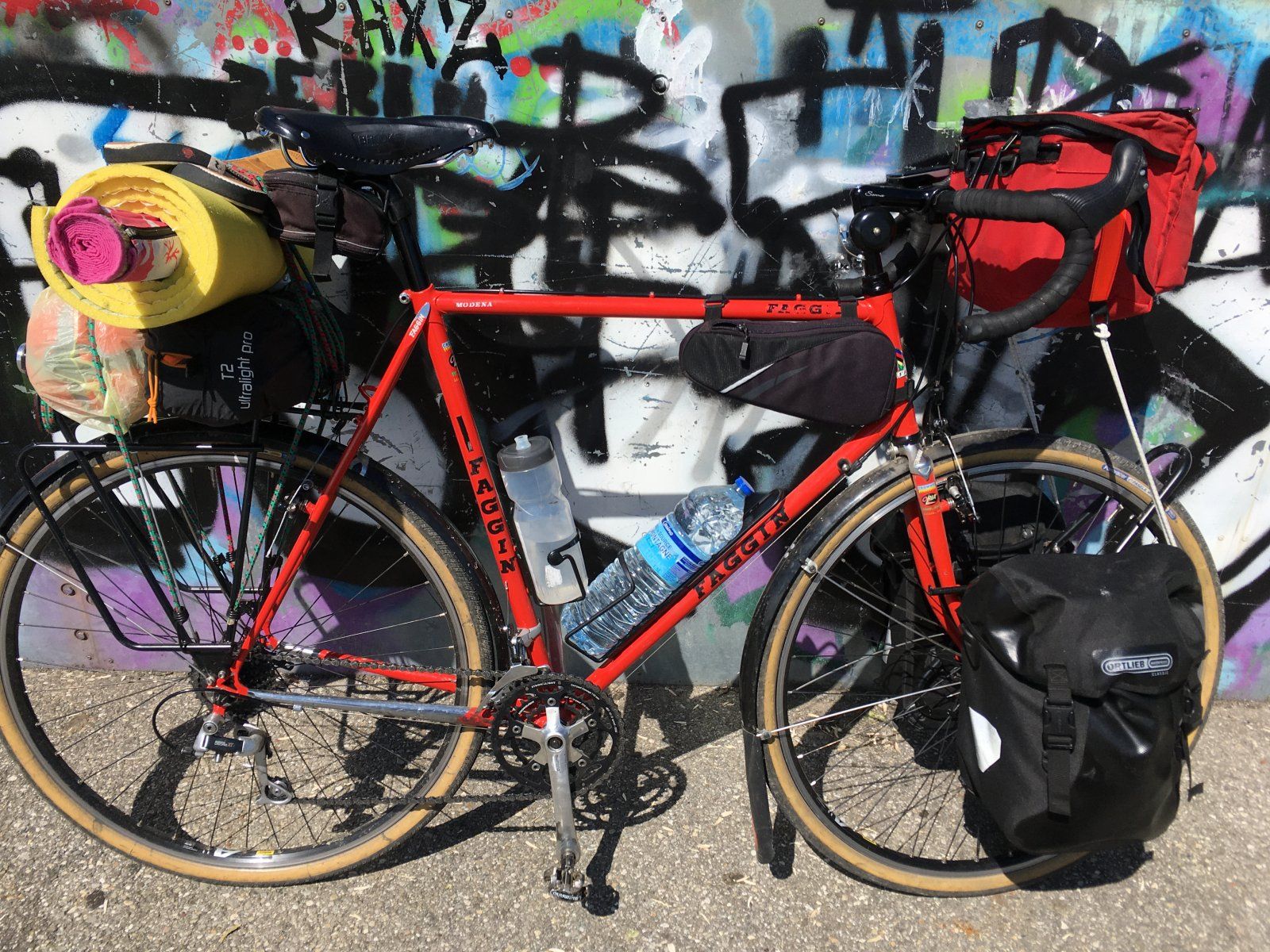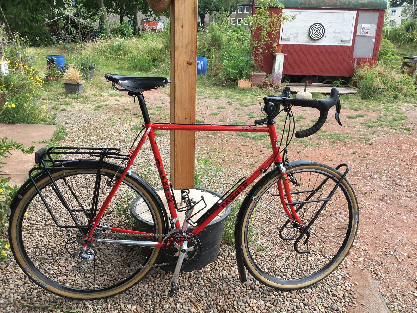 schöner aufbau. ich hab ein (fast?) identisches modell, faggin modena. beim aufbau gab es ein großes problem: die cantisockel an der gabel sind so eng aneinander, da hatte ich große mühe die tektro cantis ordentlich einzustellen. nach n paar hundert km hat sich der bremsbelag aber einigermaßen ein- und zurechtgebremst und dann passte es für knapp 2000km sommertour. hier foto vom aufbau und dann on tour.