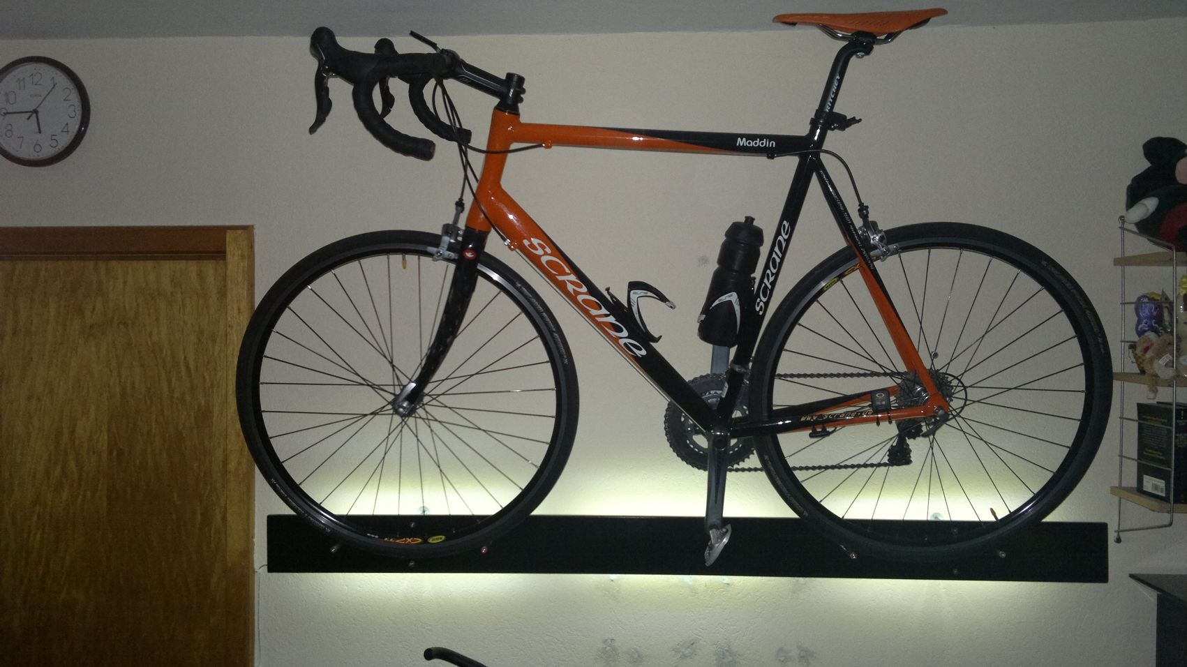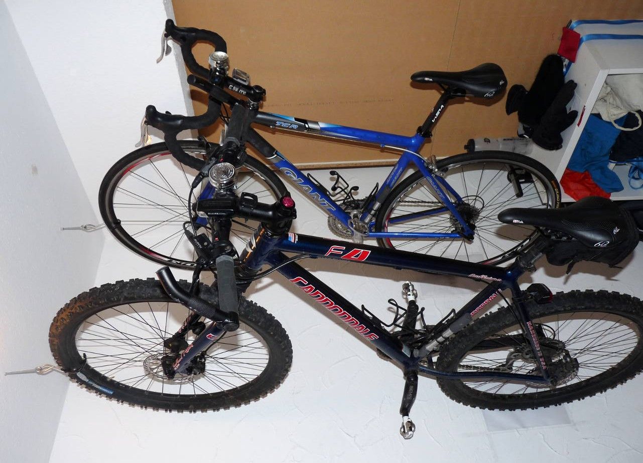 Ich käme nie auf die Idee mit Carbonpedalen als einzigen Aufhängepunkt das Rad an die Wand zu hängen. Auch wenn es keine 7Kg wiegt wäre ich mir unsicher wie sich der seitliche Druck auf einzelen Teile, auch die Laufräder, auswirkt. Meinetwegen braucht auch nur das Pedal kaputt zu gehen, dann fliegt das komplette rad runter. Muss nicht sein, so praktisch diese minimalistische Lösung auch sein mag.
