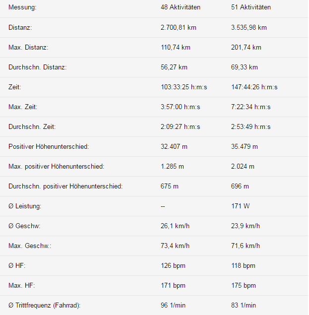Du bist dieses Jahr aber auch einfach mal 40% mehr gefahren... Wer weiß, wie stark du wärst, wenn auch noch Intensität dabei gewesen wäre.Fakt ist ja wohl eins, viele fahren im Training viel zu schnell. Wenn ich nur zum Spaß fahre, ist das ja soweit auch ok. Seit 1.12.16 bis Ende März 17 bin ich nahezu ausschließlich GA gefahren (mit PM). Das war gar nicht so schlimm wie sich das anhört und auch nicht so langsam wie es sich liest (Schnitt lag bei erbärmlichen 22-23Km/h). Aber fahrt mal zB. 3-4 Stunden zw. 65-75% FTP, das strengt fast mehr an, als 3 Stunden nach Lust und Laune durch die Gegend ballern, denn da nimmt man ja immer wieder mal die Beine hoch. Es folgte eine 1-monatige Pause und erst seit Ende April hatte ich dann Intervalle ins Training aufgenommen. Worauf ich hinaus will ist, das ich nun schneller bin und mir einige KOMs zurückholen konnte - trotz viel weniger Windunterstützung. Die Mischung machts halt und ja, pauschalen Empfehlungen sind wenig hilfreich.