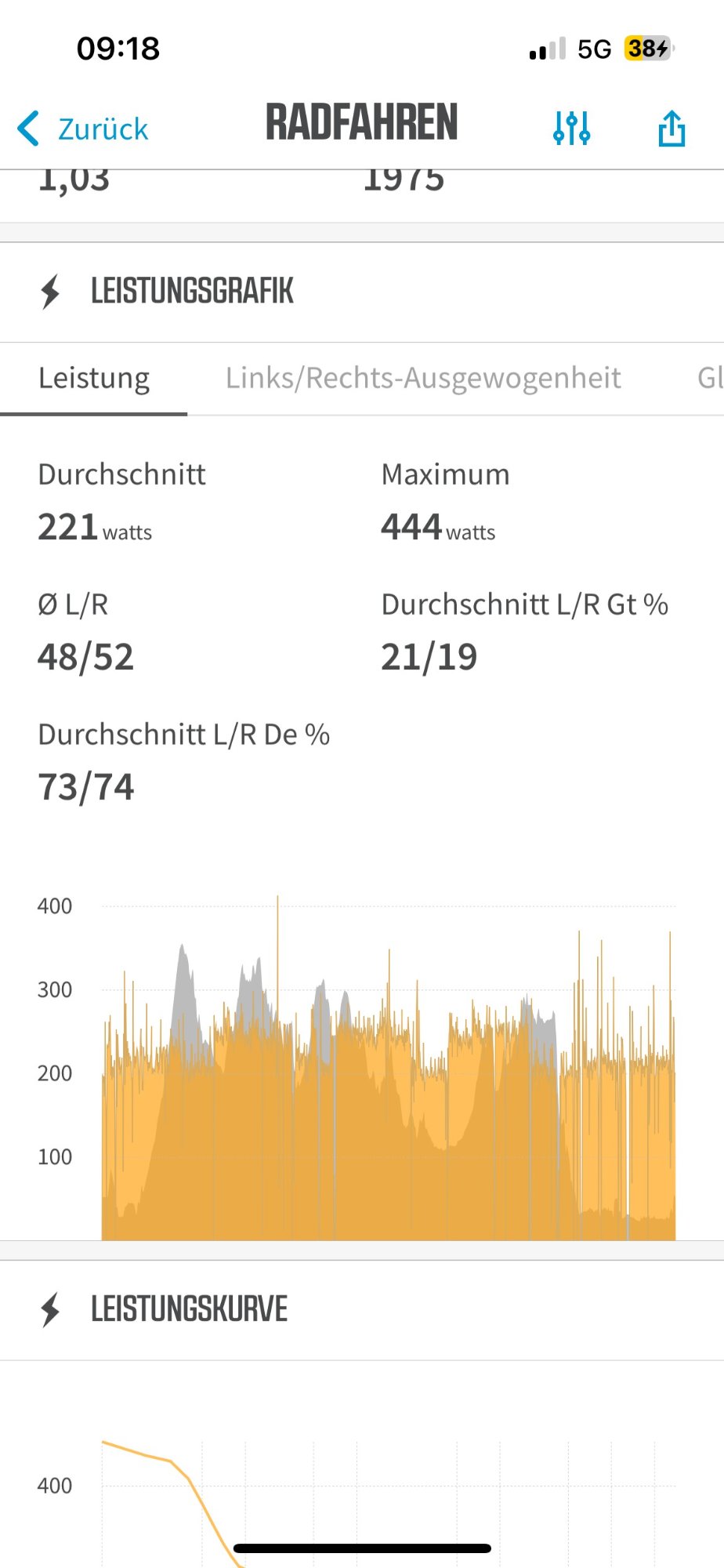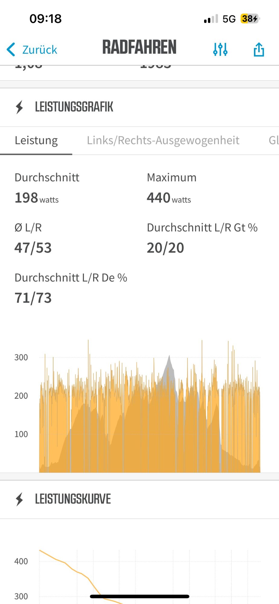 Ich hatte vor der Verletzung/Unfall 50:50, immer zwischen 49:51 und 52:48… aber es ist normal, dass die Abweichungen bei hohen Leistungen (nahezu) komplett weg gehen und bei kleineren Leistungen stärker asymmetrisch sind…Ist jetzt die Frage, ob diese Verteilung normal ist,