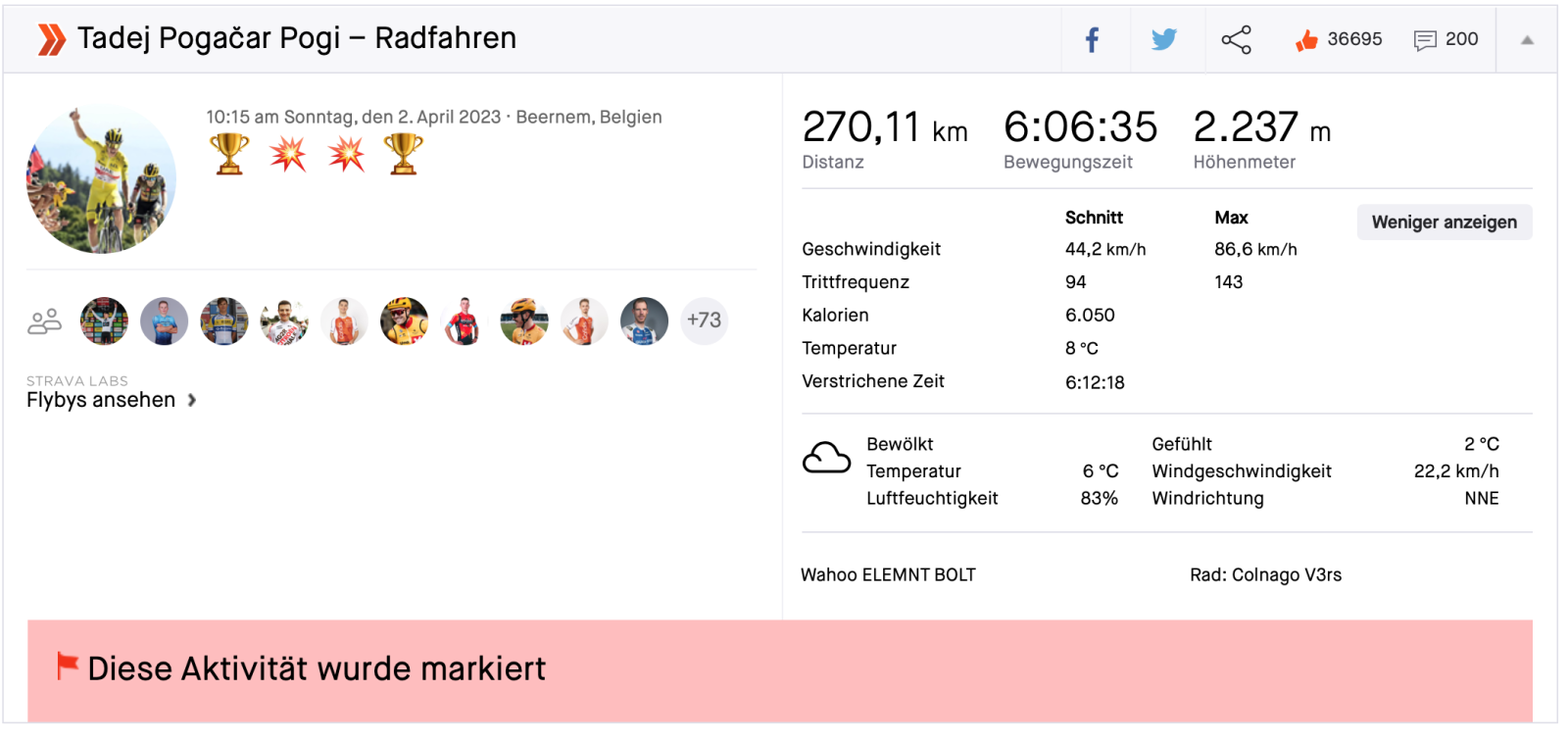 Das wurde sicher wegen den falschen Angaben zur Ausstattung gemeldetUnlogisch, das zu melden.. MvdP, klar, der hatte teilweise Motorrad-Windschatten, das darf man gem. Strava flaggen.. aber Pogi war doch sauber?!![]()