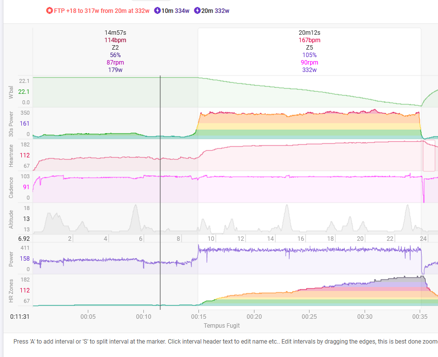 Da ich nicht jeden Monat Lust hatte auf einen FTP Test, hab ich einfach für mich selbst die Watt selbst erhöht bei den Einheiten. Hat auch soweit gepasst, da die Fortschritte dann irgendwann spürbar waren. Heute dann auf Zwift (da ich keine 20 Min lange Strecke hier habe) gefahren bei maximaler Kühlung. Vorher durch die SST Intervalle mir einen Start-Wert für die Watt erarbeitet, den ich dann halten wollte.