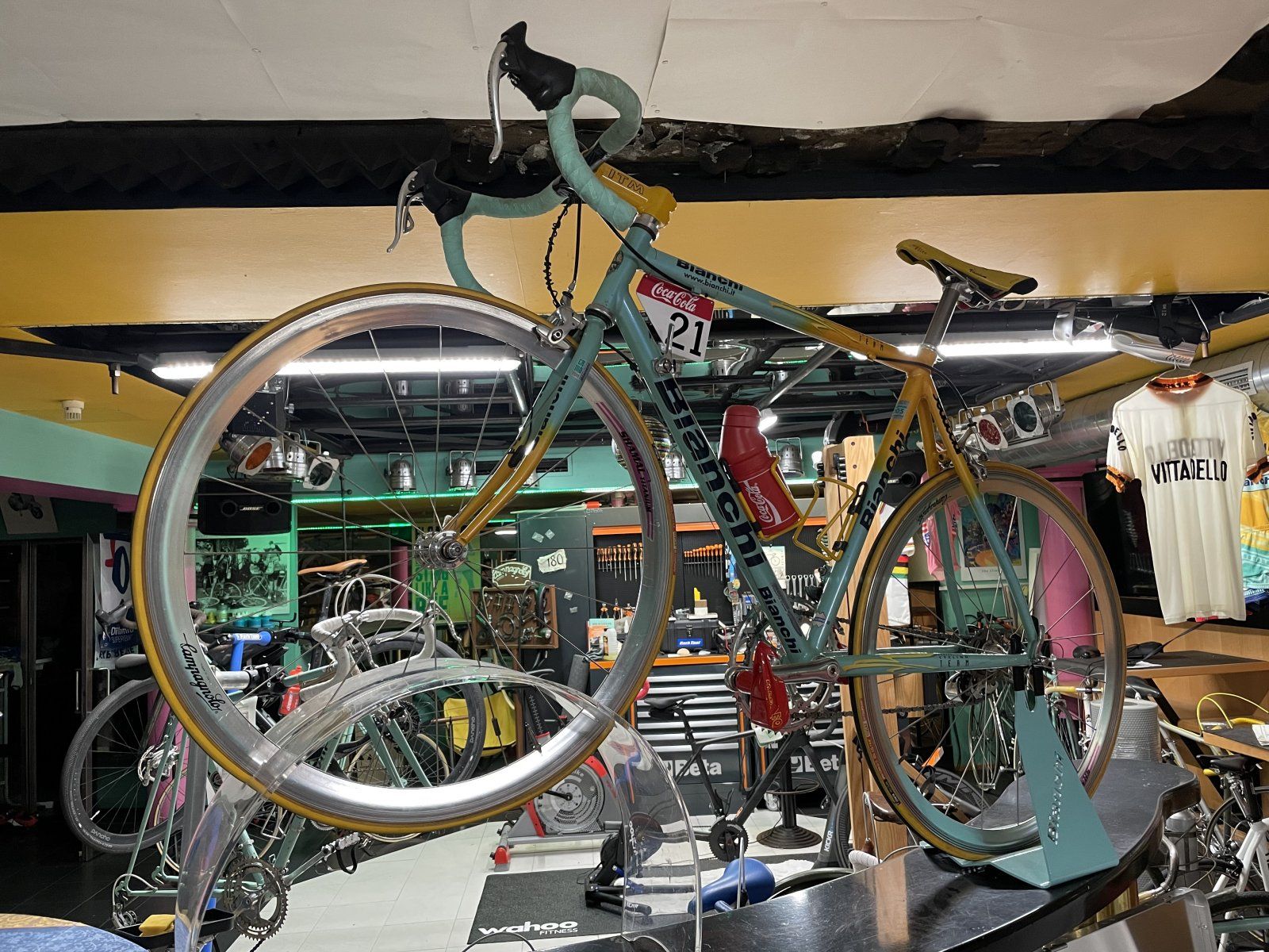 Ein Alan mit Campagnolo, Panzerband und Licht und zerstörtem Rahmen.