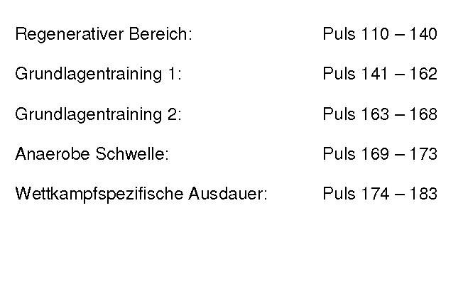 Kenne mich mit den deutschen Begriffen und Zonen nicht so ganz genau aus. Daher die Frage, wie die einzelnen Zonen definiert sind. Darüberhinaus ist noch wichtig zu wissen, wie dein Maxpuls und der Puls an der anaeroben Schwelle ist.