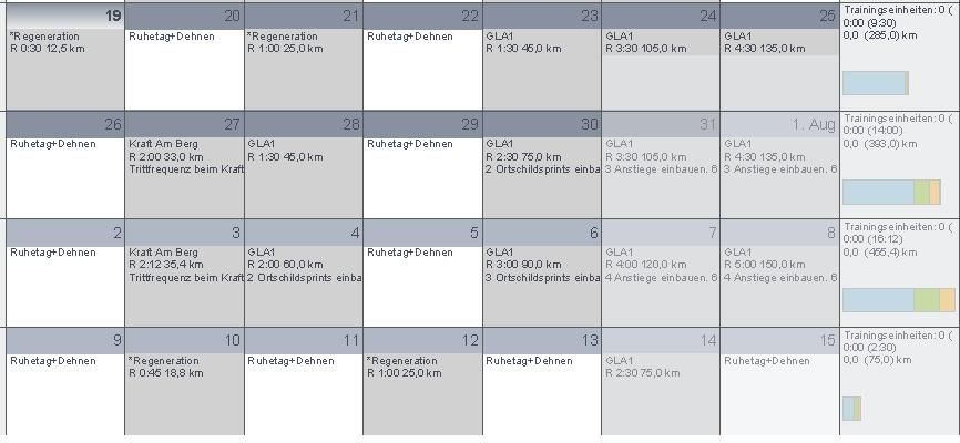 Ich kann auch nicht nachvollziehen, wieso man in einer Ruhewoche (4 Woche in Deinem Plan) nur 2:30 h macht und dann die erste Woche des Trainingsblocks (ab Datum 19.) auch zwei Regenerationseinheiten. Das scheint mir zuviel Regeneration. Es kann allerdings sein, dass Du nach den 16 h in Woche 3 total ausgebrannt bist und die Zeit zur Regeneration brauchst, aber auch dann läuft mMn was falsch. Diese Anmerkungen von mir stehen natürlich alle unter dem Vorbehalt, dass ich den Rest des Plans nicht kenne, also keinen Gesamtüberblick habe!!!!