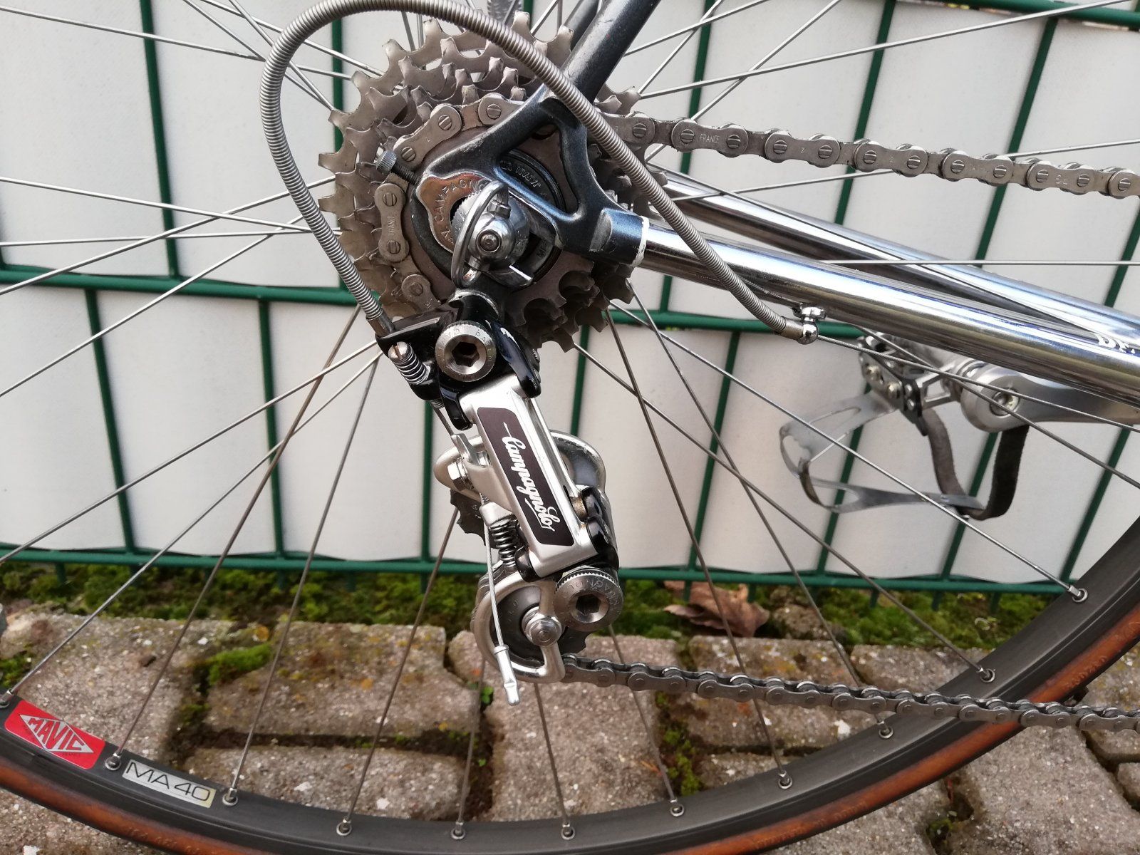 Zum Rahmen kann ich leider nicht viel erzählen. Das Rad kam aus Bayern mit einem wilden Super Record/Daytona Mix zu mir und wurde laut Verkäufer viel von einem Amateur gefahren. Der Rahmen hatte auch viele kleine Lackschäden und minimal Rost aber dank meiner umfangreichen Nagellacksammlung konnte alles problemlos ausgebessert werden.
