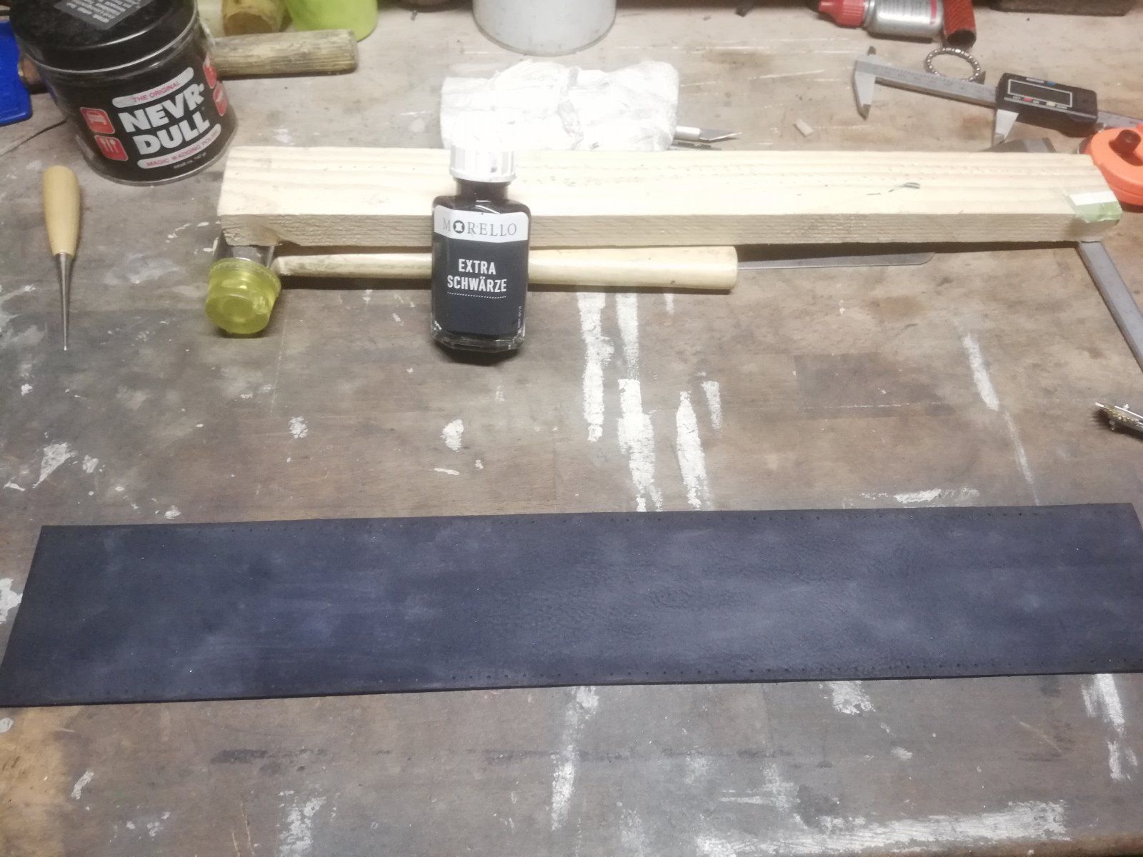 Das Leder nass zu vernähen ist deutlich dankbarer. Wenn es trocknet, zieht es sich fester und durch den Kreuzstich zieht sich auch ebenfalls die Naht festerHeute ging es wieder an das Lenkereinnähen. Zunächst wurde der Rohling zugeschnitten und die Löcher mit einer Ahle erzeugt. Die Farbe wurde nicht ganz gleichmäßig sieht nun aber sehr vintage aus.