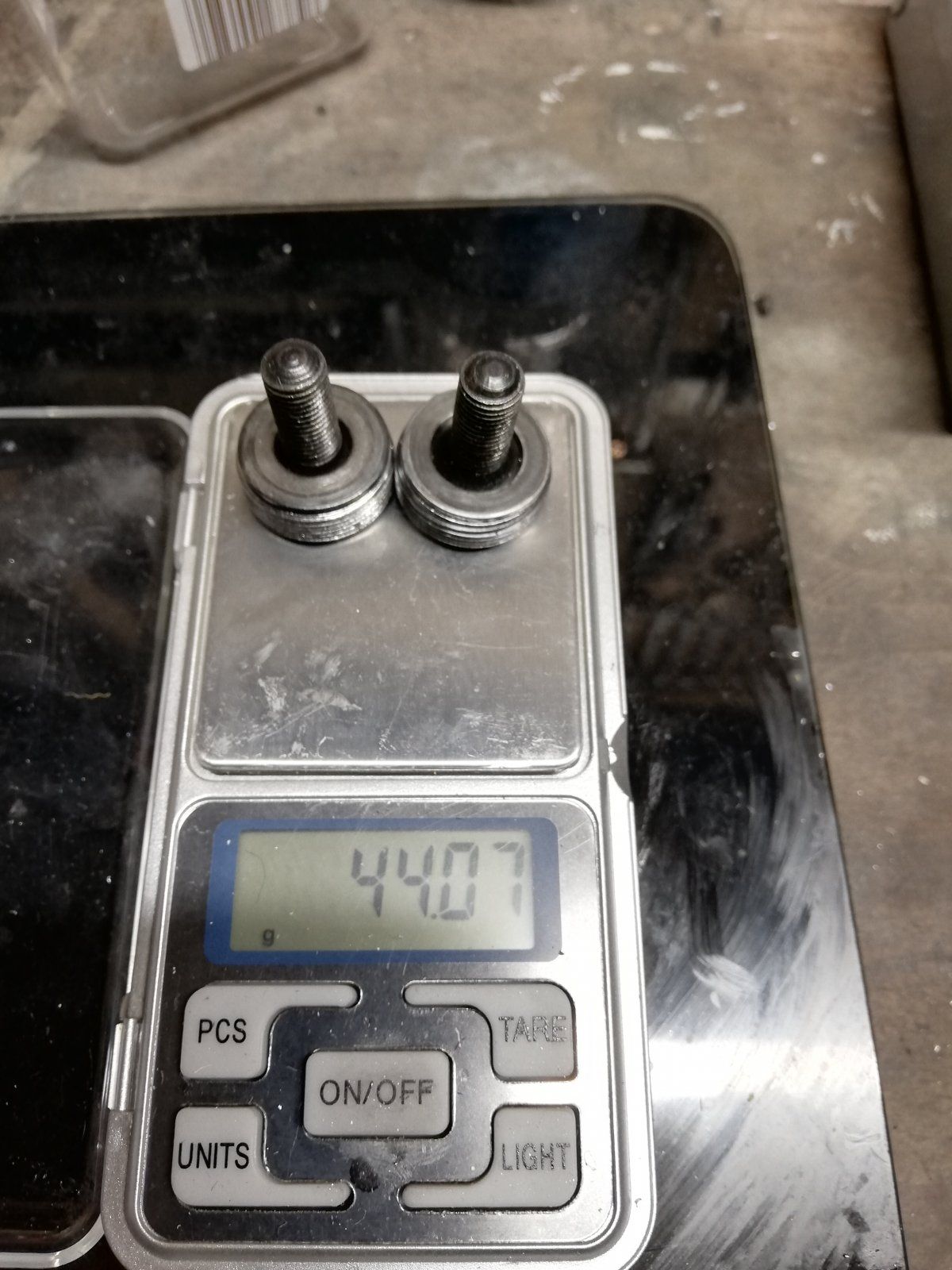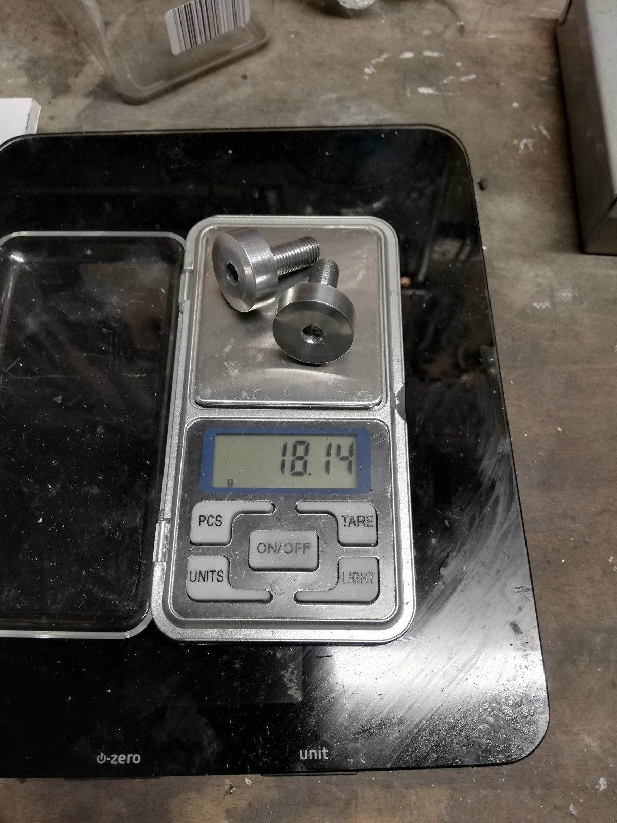 Campa Schaltwerkbolzen 7g und damit nur 3g leichter als das Original. Da ich aber eh das Gewinde vermasselt habe und der gewichtsunterschied so gering ist, werde ich beim Original bleiben.