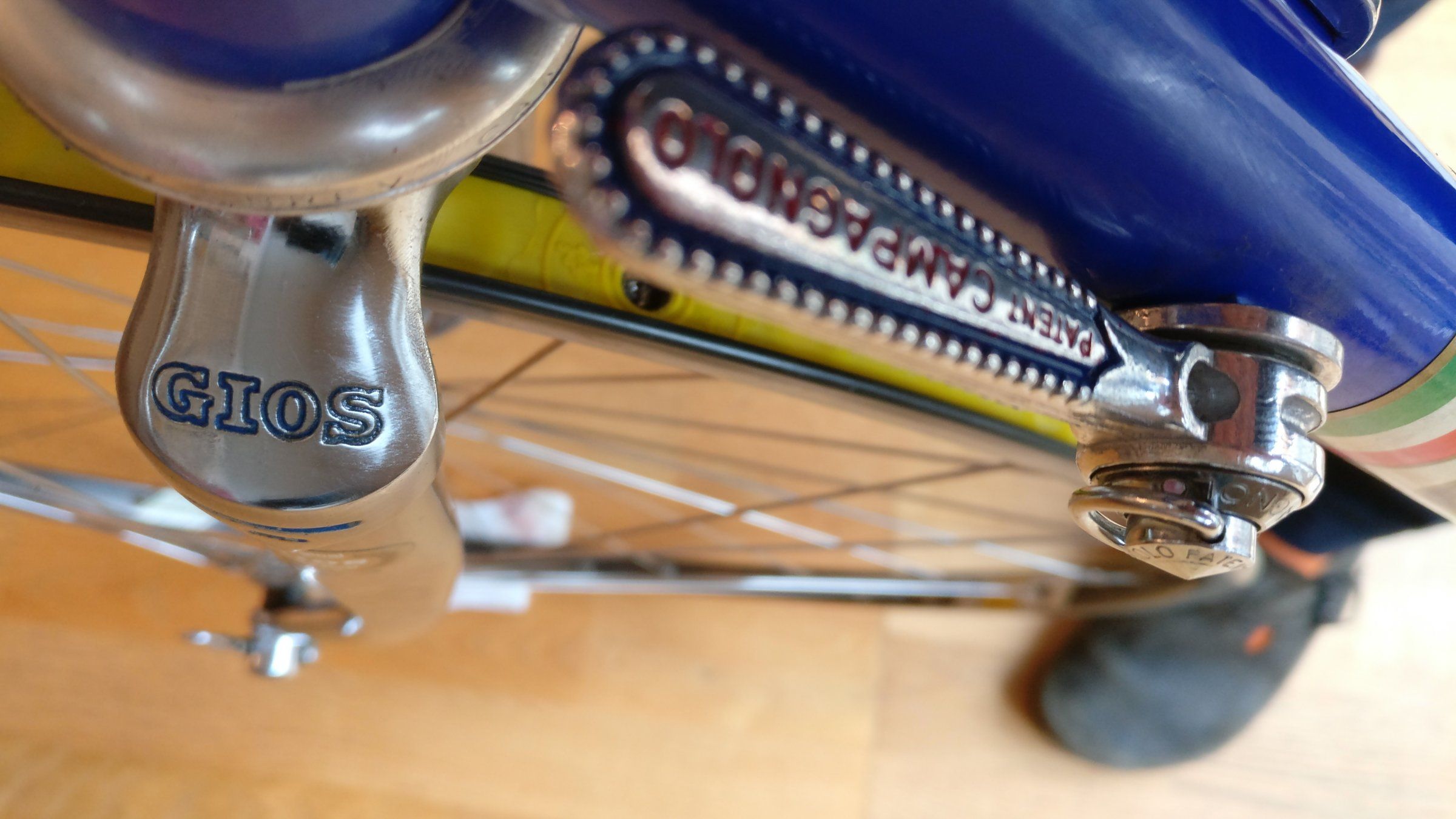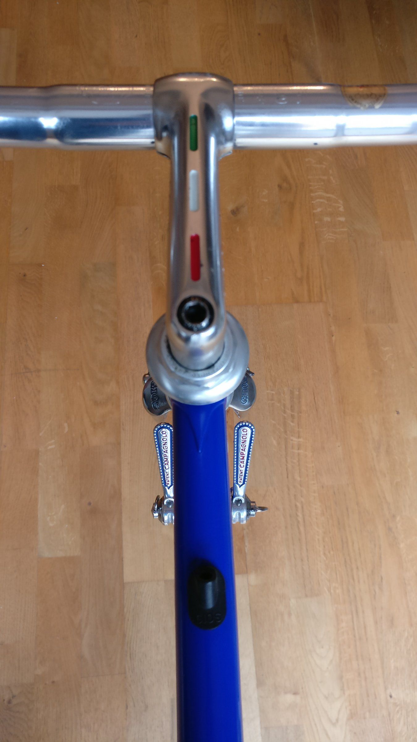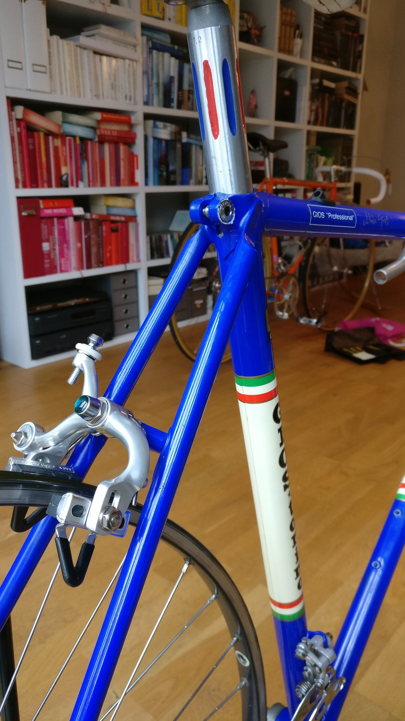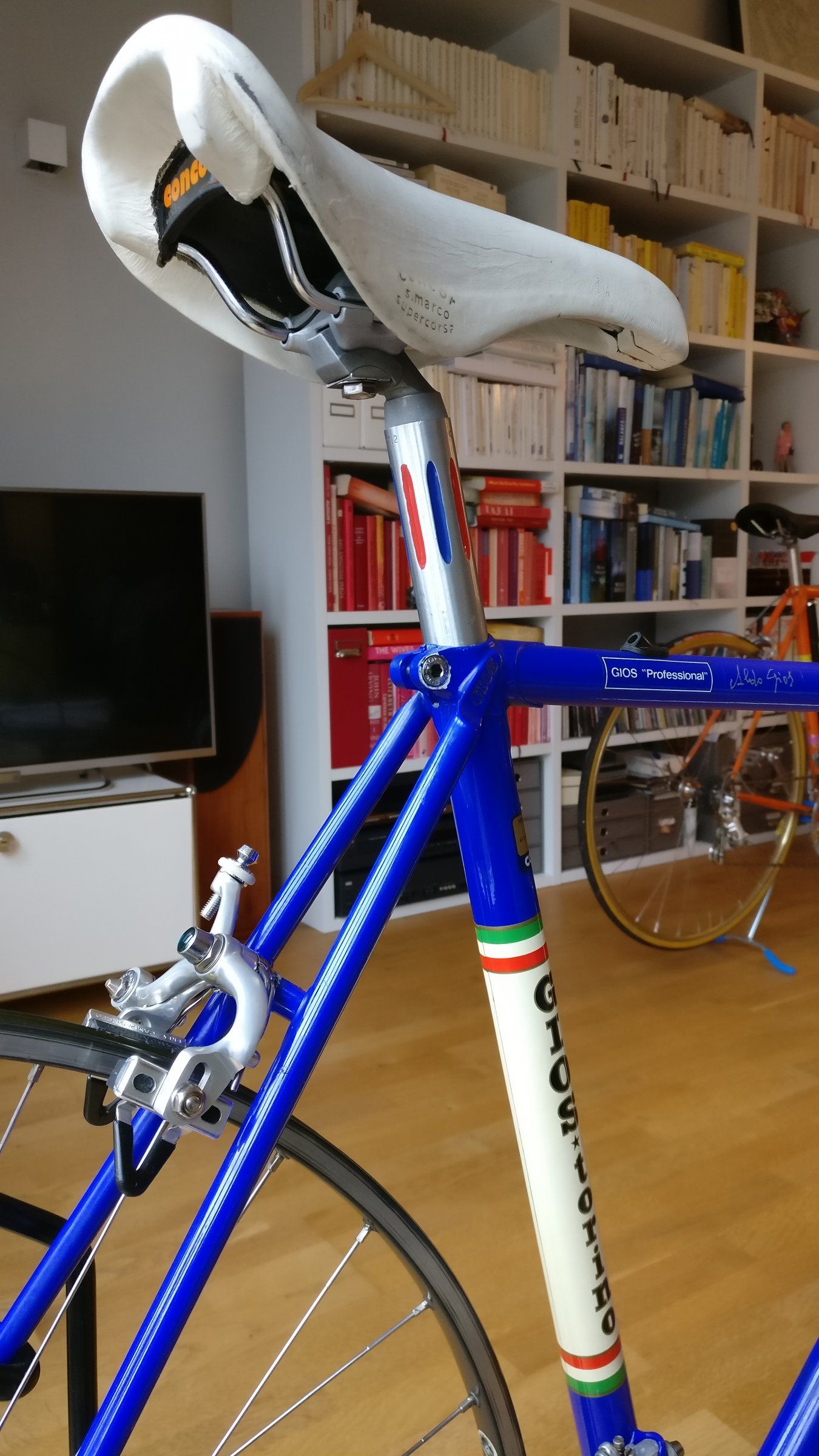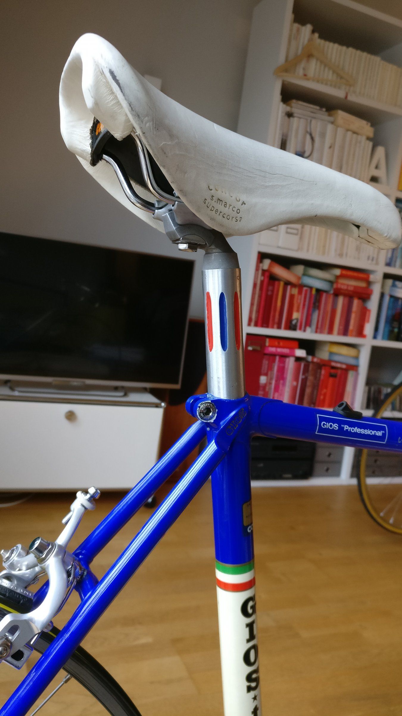 Aber jedes Vintage-Bike braucht braunes Lederband, das war früher auch so. Wirklich!Wenn ich die Zugverlegung sehe und wie der Umwerfer zu den Kettenblättern hängt, muss das Rad erst mal zu jemandem, der sich damit auskennt. Blau mit Braun löst auch keine Haben Will Reflexe aus.