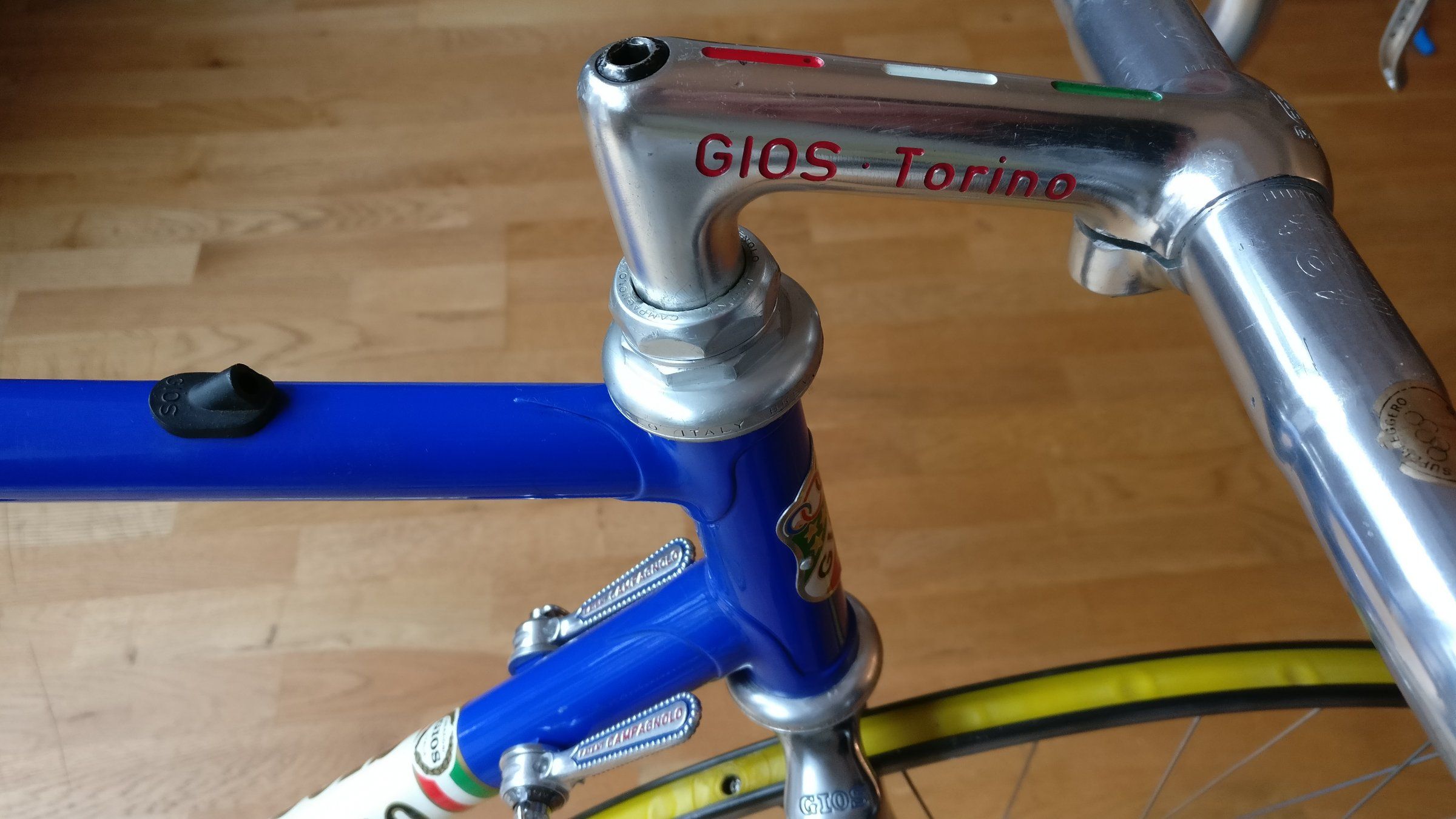 Aldo und Marco haben den Rahmen nicht nur neu lackiert sondern auch das Oberrohr getauscht. Nach dem Entlacken offenbarte sich da nämlich ein kleines Löchlein wegen Rostfraß von innen. Da war wohl an den Gummitüllen vorbei Wasser eingedrungen.