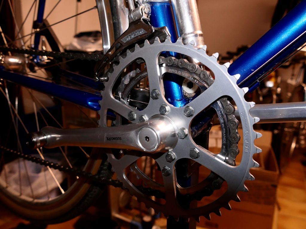Das TA-Blatt ist etwas anders als das vorherige Sugino. Die Zähne sind exzentrisch, so dass die Kette zwischen die Blätter fällt. Zum Glück hatte ich noch einen Satz schmale Distanzringe, also habe ich die gleich noch getauscht und so sie Blätter etwas weiter zusammengerückt. Jetzt schleift das Blatt auch nimmer am Schaltzug.