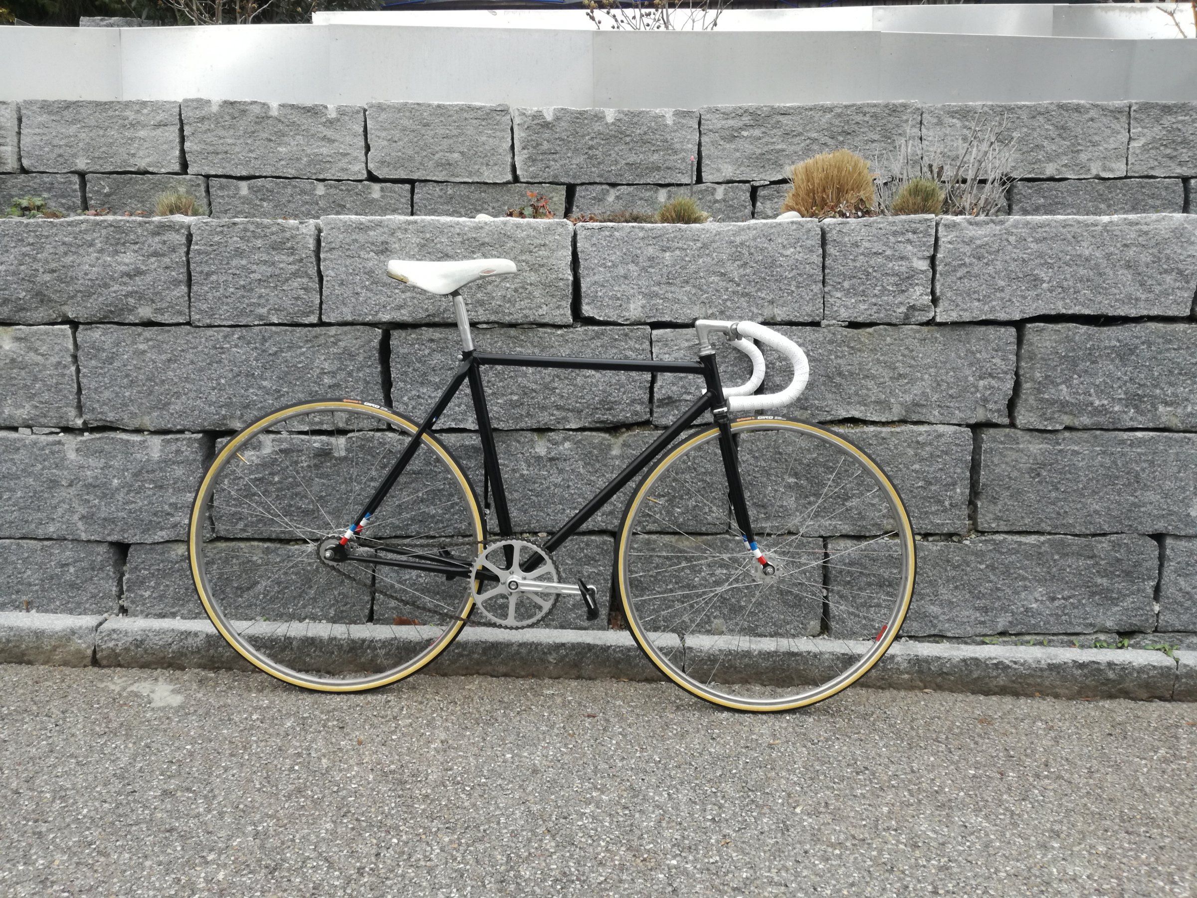 Kette kommt noch, auch das Hinterrad muss noch fertig zentriert werden. Textilband wäre noch eine gute Alternative, hätte noch blaues Klebeband. Nochmals Tricolore wäre meiner Meinung zu viel.Ich find das Weiß viel zu dominant, es raubt dem Rahmen den Schick.