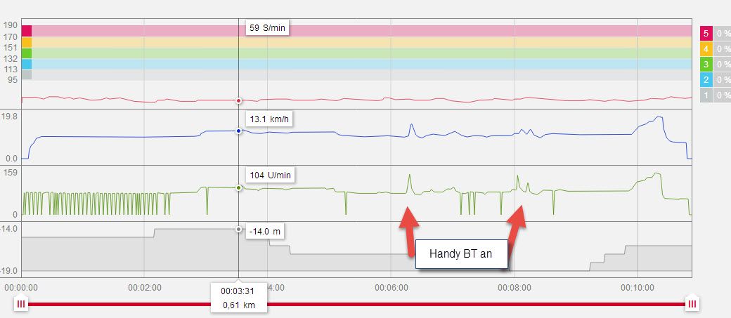 Die ersten 2-3min hat der Trittfrequenz Sensor immer Ausfälle und zeigt Null an.
