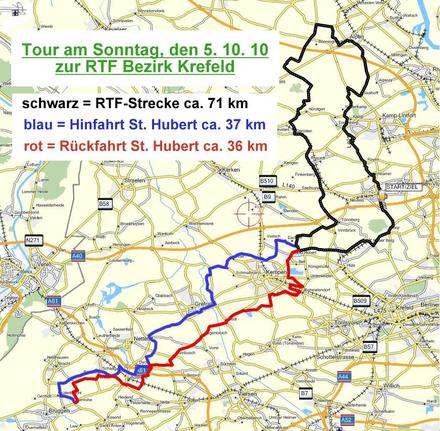 Sonntag ist eine Fahrt zu START/ZIEL der RTF vom Bezirk Krefeld in Neukirchen-Vluyn vorgesehen. Wir werden im Raum Sankt Hubert in die RTF-Strecke einsteigen. Da die vorgesehene An- und Abfahrt schon mehr als 70 km beträgt, schlage ich vor, die 71er RTF-Strecke zu fahren, so dass wir insgesamt auf ca. 150 km kommen.