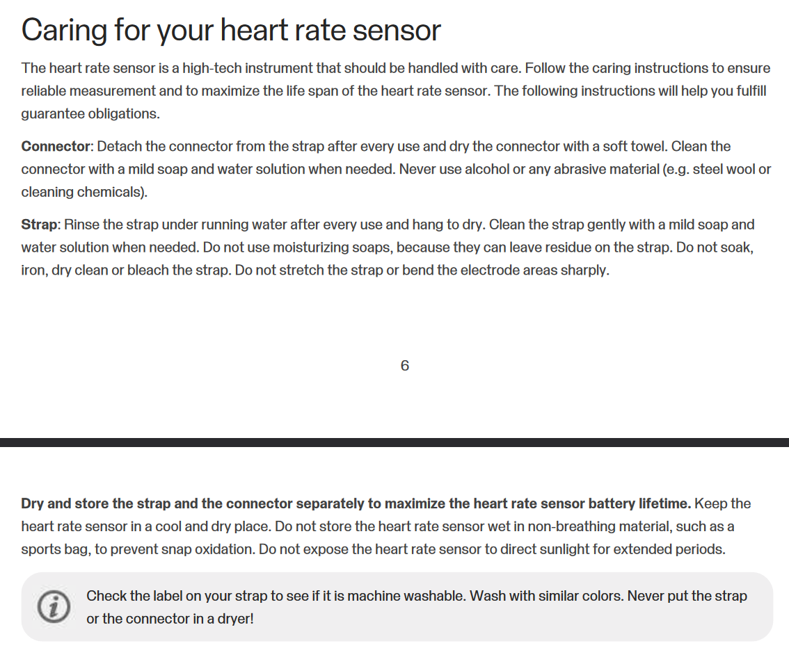 Der Sender gehört nach jeder Fahrt abgeklipst, damit der Schweiß der sich darunter sammelt mit einem Handtuch abgetrocknet werden kann. Genauso wie man den Gurt wenigstens nach jeder Nutzung im Waschbecken mit Seife kurz durchspült (vorsichtig ohne ihn zu knicken). Zum einen wegen der Hygiene und zum anderen um die Kontaktflächen sauber zu halten (von Schweiß, Salz usw.). Dann halten die Gurte auch länger.