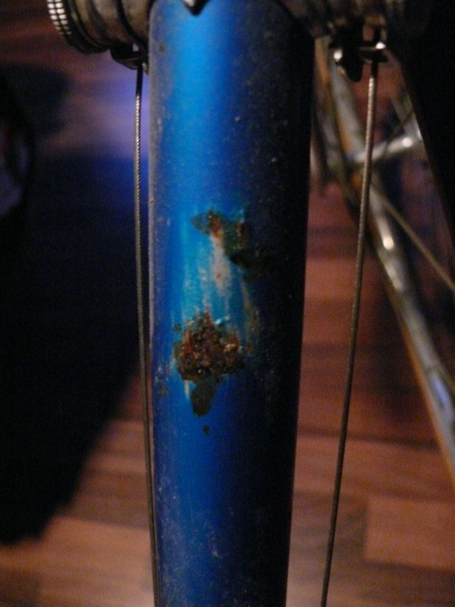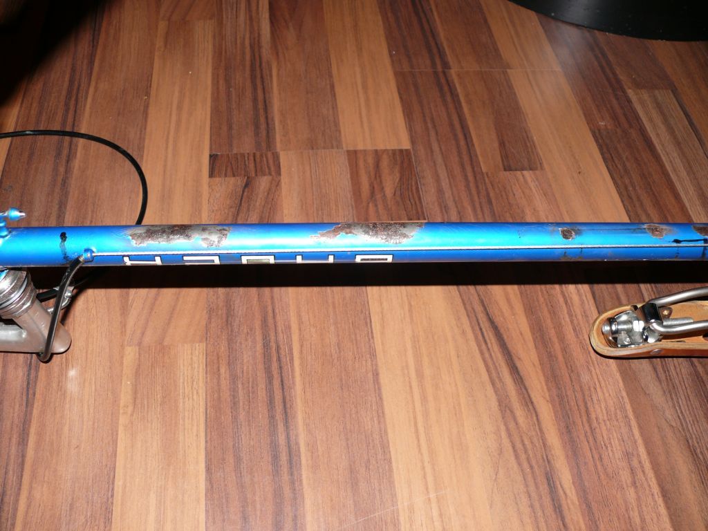 Der Rahmen aus 531 Reynolds hat keine Dellen oder Stauchungen,aber viel Rost vornehmlich an den Unterseiten des Geröhrs.Da hat der Vorbesitzer wohl viel drauf geschwitzt...