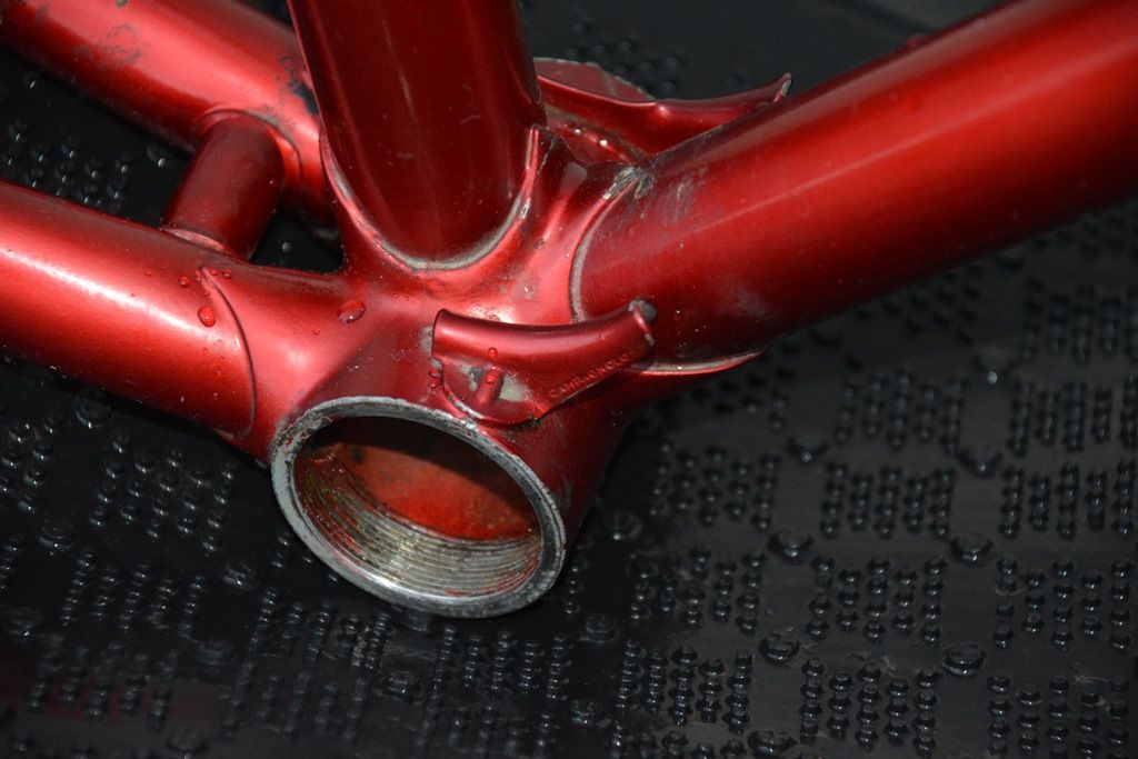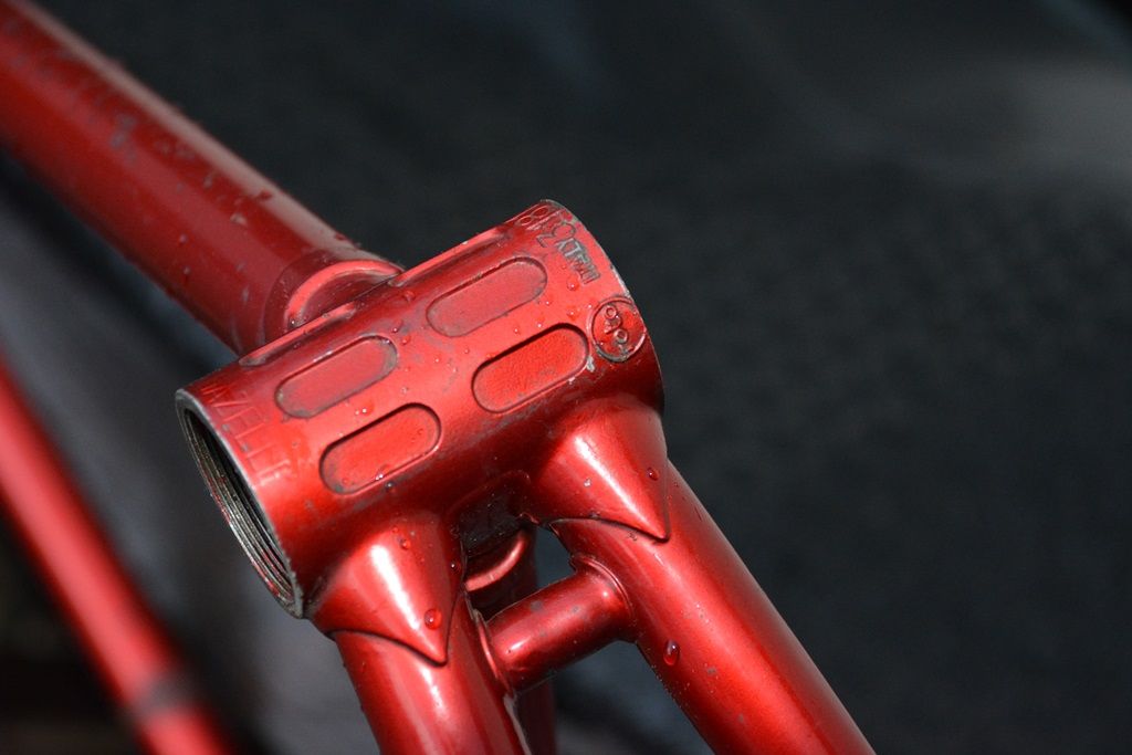 muffenlos, oversized Rohre, macht keinen hochwertigen Eindruck. Aber bemerkenswert und nicht gerade alltäglich finde ich die Bremszugführung durchs Sitzrohr, die Sitzstreben, die Anlötteile an der Kettenstrebe zur Montage für Speichen als Lackschutz und die Möglichkeit, 3 Flahas anzubringen. Am Steuerrohr sind vertikal 2 Löcher im Abstand von 40 mm, da war wohl mal ein Schild angenietet. Sattelstütze 27,2 mm.