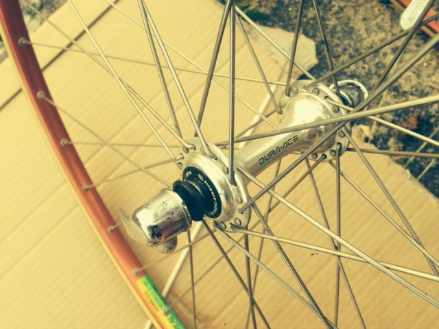 Die Kurbeln habe leichte, leicht auspolierbare Kratzerchen, ebenso der rechte Bremshebel. Die Hütlis sind leicht porös. Bremsflanken der roten Ambrosios kaum angebremst. Pedale haben noch den kompletten, schwarzen Lack. HR Nabe muss neu gefettet werden.