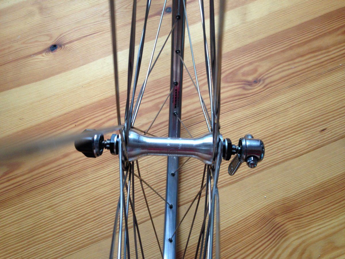 Ähem,... Die Nabe hinten ist irgendwie falsch eingespeicht... auf der Antriebsseite müssten die Speichen gekreuzt sein, sind se aber nicht. Ich habe alte Roval-Naben und Laufräder gesehen. Bei keinem war das serienmässig so und irgendeinen Sinn macht's sowieso nicht. Im Gegenteil...