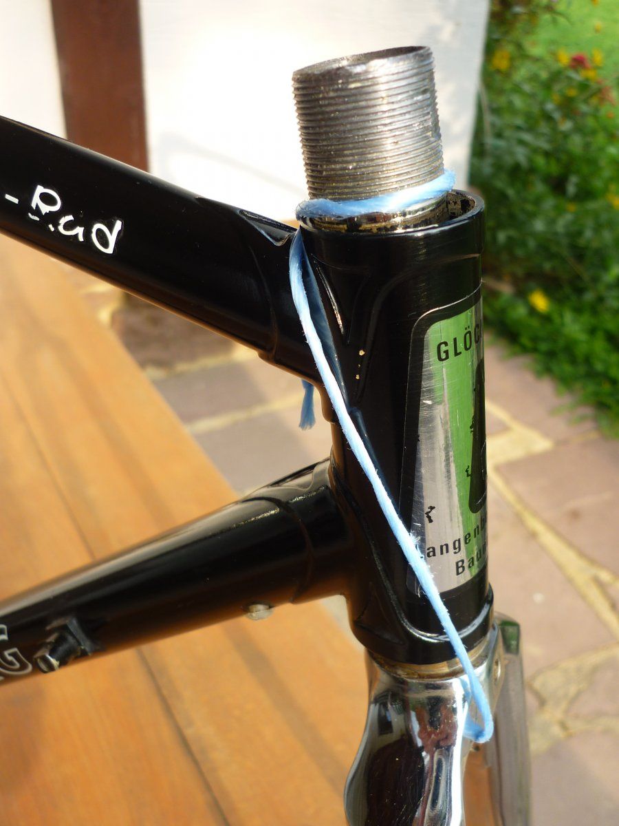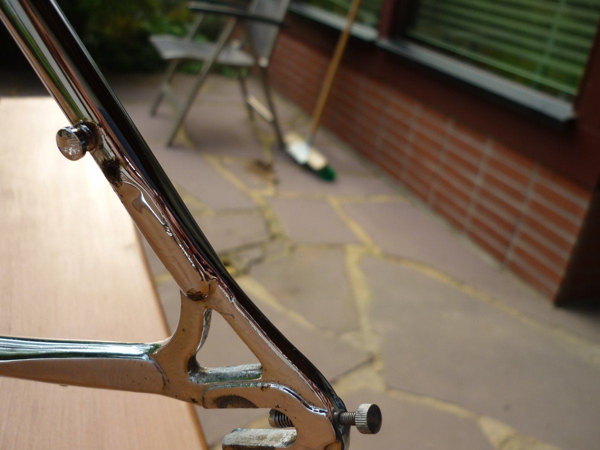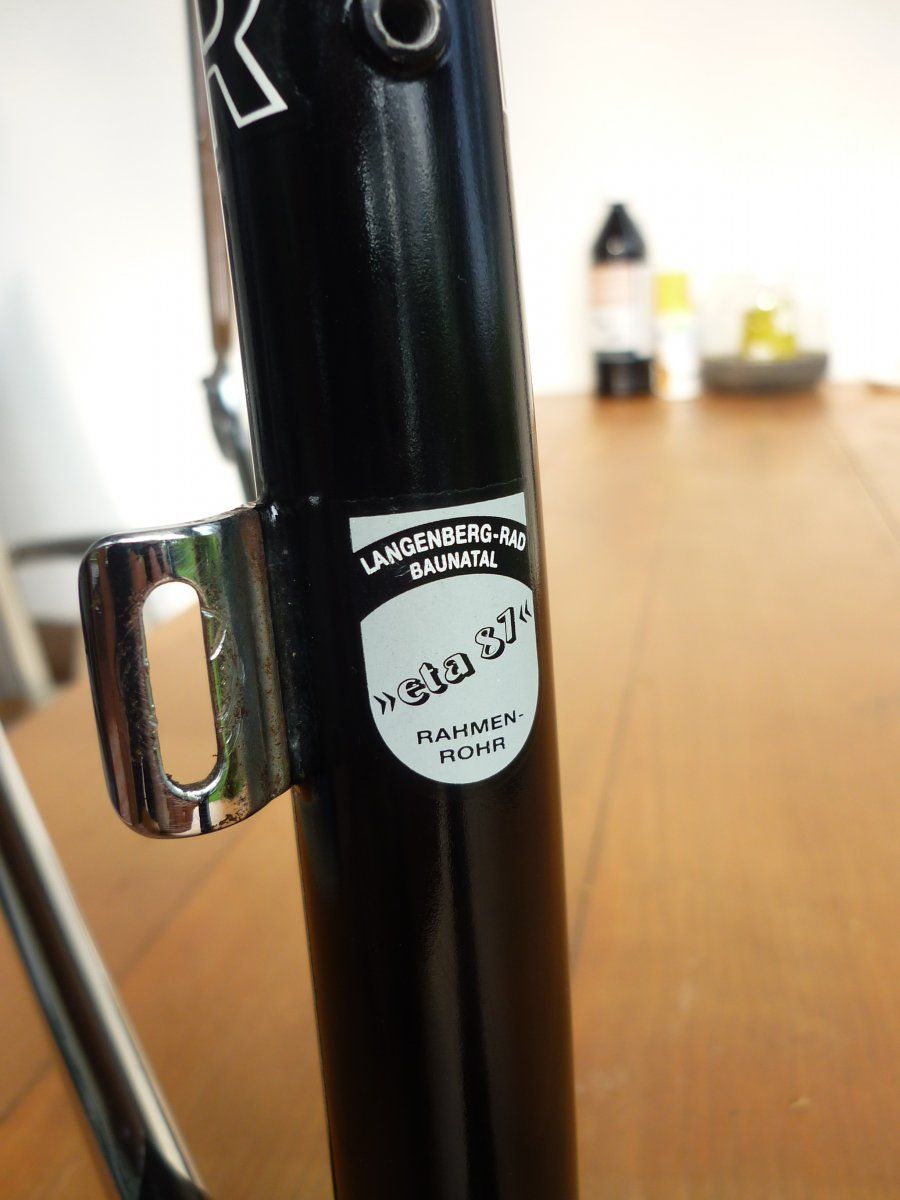 Ich habe vor kurzem mal diesen Langenberg Rahmen aufgesammelt. Mir ist er leider doch zu klein (51m-m, OR dasselbe), ich habe mehrere Projekte offen (keine Zeit und kein Geld für weitere) und bis ich den irgendwann mal aufbaue dauert es wahrscheinlich doch zu lange und ich glaube dafür ist er zu schade. Was könnte man forumsintern dafür aufrufen? Zustand ist auf den Bildern denke ich ganz gut zu erkennen. Gebrauchsspuren hat er: Das Oberrohr hat etwas gelitten, auf der linken Seite des Unterrohrs sind die Decals mitgenommen, auch im Sattelrohr gibt es ein paar Lackabplatzer, alles nicht so schlimm, kann man ausbessern. Chrom an Ketten- und Sitzstrebe hat etwas gelitten. Soweit ich das sehen kann aber technisch einwandfrei. Rahmen nackig wiegt 1900 Gr., Rahmenset 2600 Gr. Das Rohr "eta 87" (oder eta S7??) kenne ich nicht - vielleicht weiß ja jemand was dazu, das würde mich interessieren.