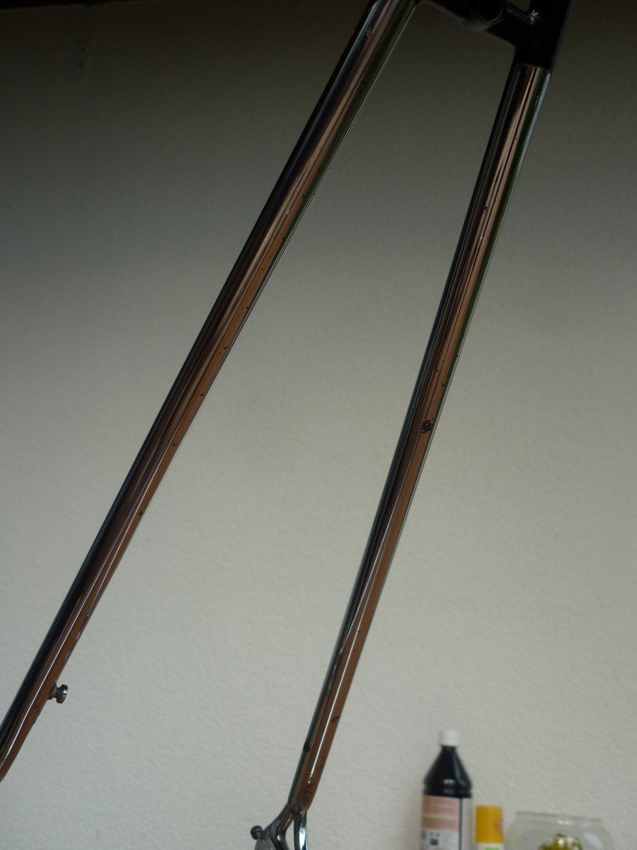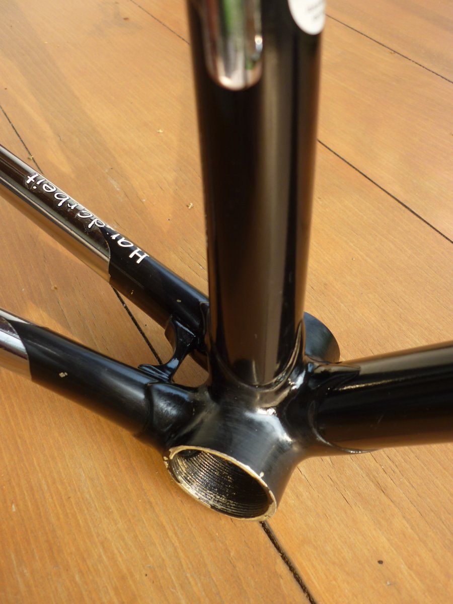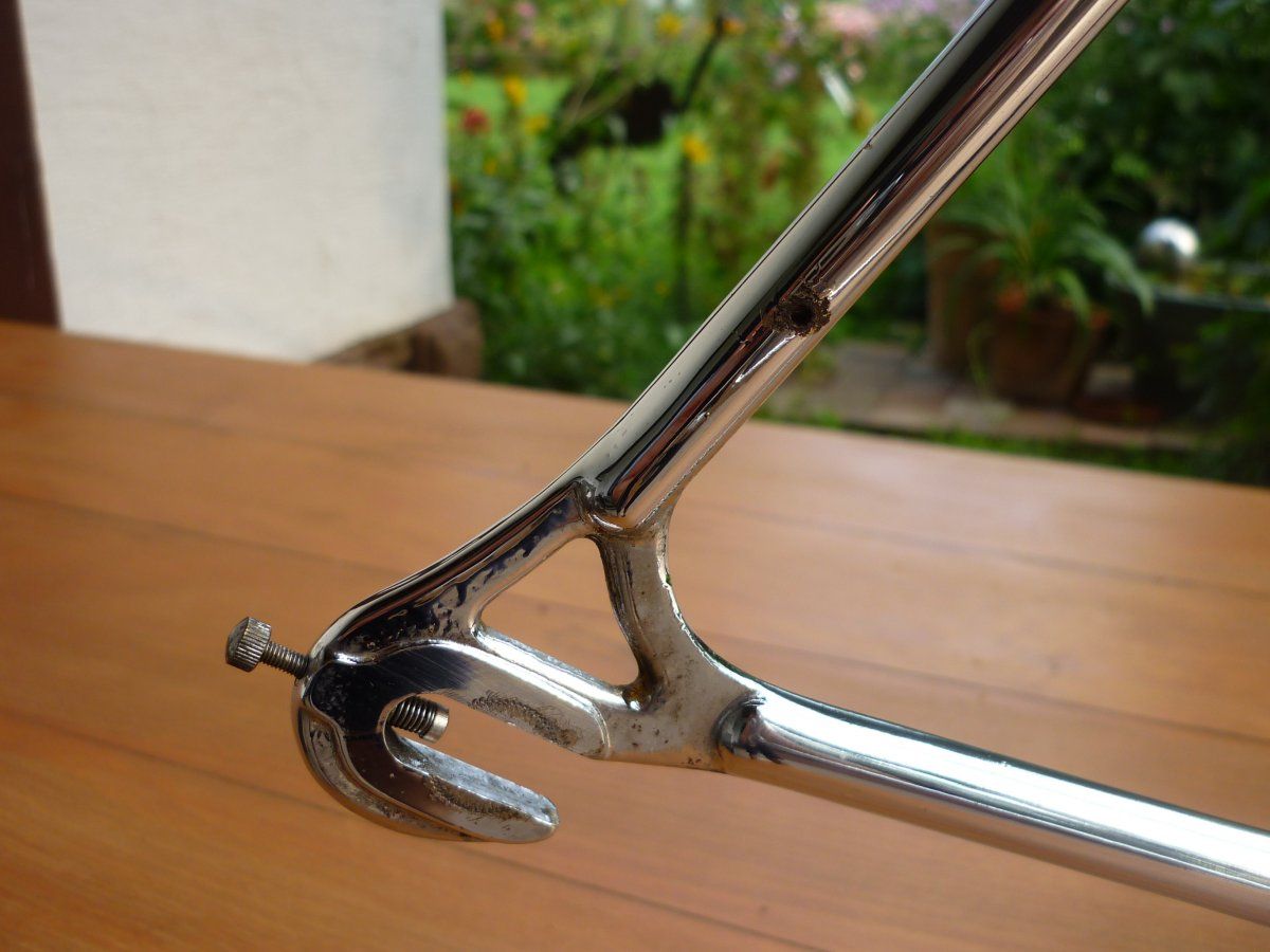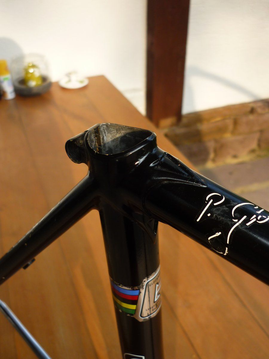 Ich habe vor kurzem mal diesen Langenberg Rahmen aufgesammelt. Mir ist er leider doch zu klein (51m-m, OR dasselbe), ich habe mehrere Projekte offen (keine Zeit und kein Geld für weitere) und bis ich den irgendwann mal aufbaue dauert es wahrscheinlich doch zu lange und ich glaube dafür ist er zu schade. Was könnte man forumsintern dafür aufrufen? Zustand ist auf den Bildern denke ich ganz gut zu erkennen. Gebrauchsspuren hat er: Das Oberrohr hat etwas gelitten, auf der linken Seite des Unterrohrs sind die Decals mitgenommen, auch im Sattelrohr gibt es ein paar Lackabplatzer, alles nicht so schlimm, kann man ausbessern. Chrom an Ketten- und Sitzstrebe hat etwas gelitten. Soweit ich das sehen kann aber technisch einwandfrei. Rahmen nackig wiegt 1900 Gr., Rahmenset 2600 Gr. Das Rohr "eta 87" (oder eta S7??) kenne ich nicht - vielleicht weiß ja jemand was dazu, das würde mich interessieren.