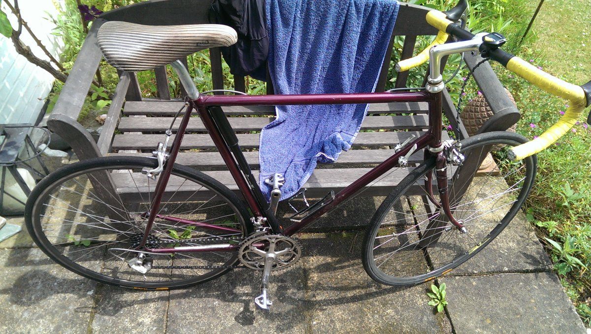 Den Zustand der Anbauteile würde ich als sehr genutzt beschreiben, aber einwandfrei fahrbar. Anbei ein Foto, mittlerweile ist das Rad geputzt und im Trockenen. Den Rahmen konnte ich dirch die Sannino-Gravur am Tretlagergehäuse und dem Rohrsatz erkennen.