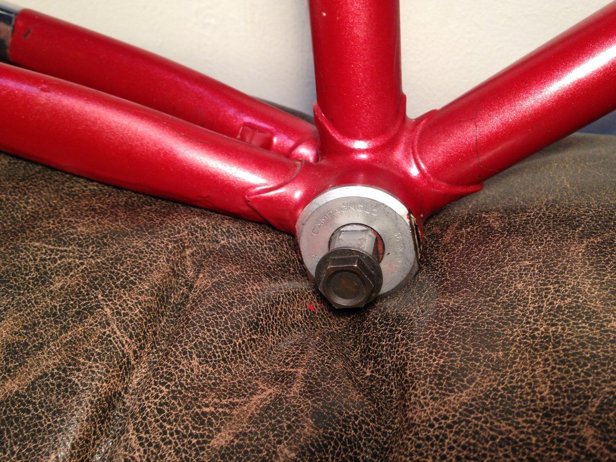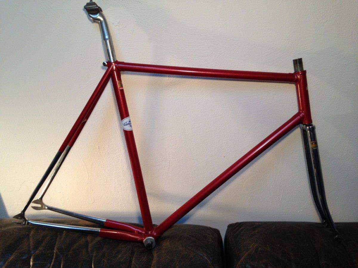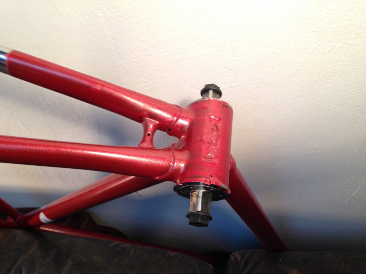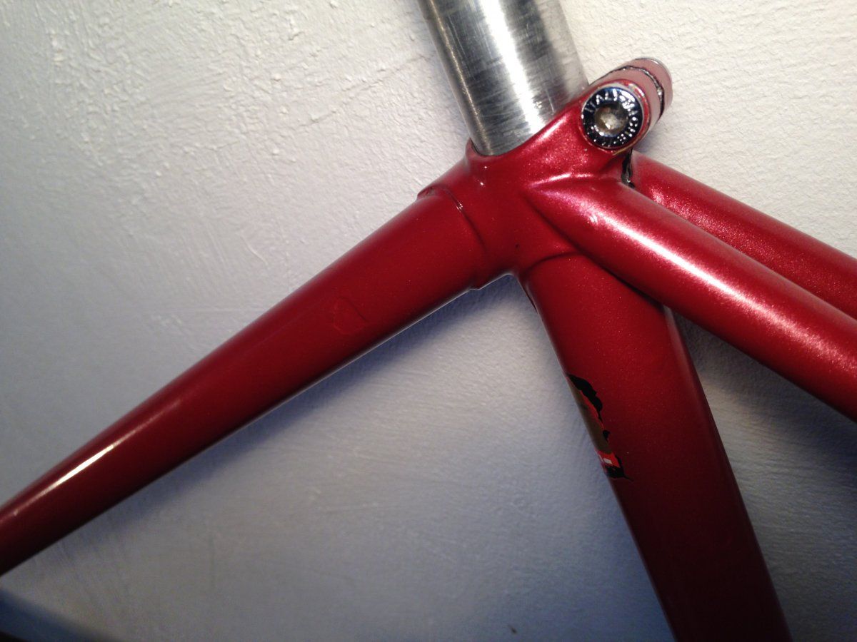 hast du mal einen link zur auktion?An die Bahnrad-Experten: Ich habe mir ein schickes Cinelli Bahnrad geschossen. Ich habe das Rahmenset so wie auf den Bildern zu sehen bekommen. Der Rahmen wurde (leider) mal unprofessionell überlackiert. Dabei wurde der alte Lack scheinbar einfach überlackiert. Zum einen sieht man das daran, das ältere Lackplatzer einfach überlackiert wurden, und dass an einigen angekratzten Stellen der alte Lack (schwarz/pink) zu sehen ist. Um den Columbus SLX Aufkleber wurde einfach `drumherumlackiert`! Deswegen gehe ich auch davon aus, dass der Columbus SLX Aufkleber original ist, also der Rohrsatz auch tatsächlich ein Columbus SLX ist (Ausfallenden sind auch Columbus). Ansonsten ist am Tretlager das Cinelli Emblem eingearbeitet.
