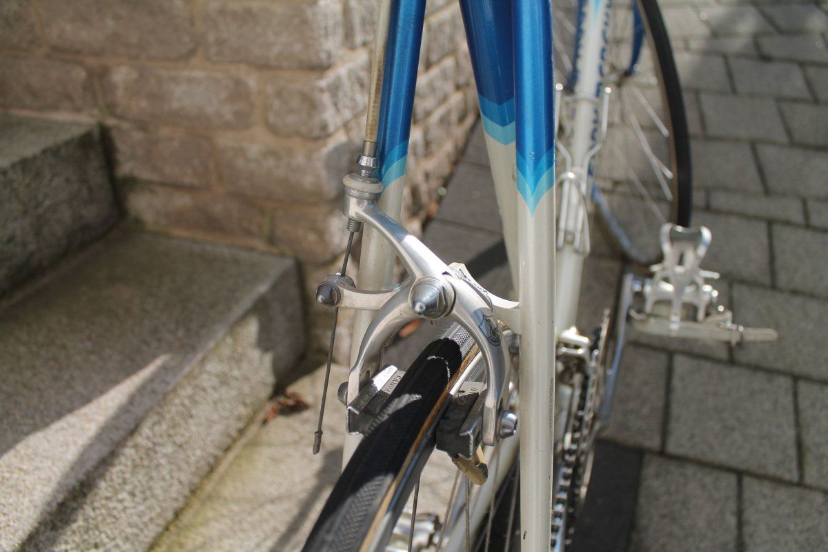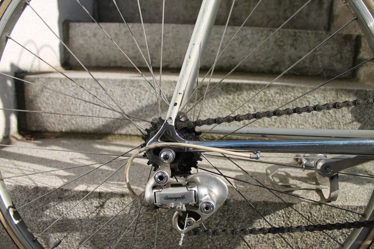 Eddie Merckx Corsa Extra, unbekannte Campa Komponenten (Chorus?), soll zwecks Reiserad Anschaffung verkauft werden. Nicht aufgehübscht für die Fotos, Macken an der hinteren rechten Strebe sind die einzig gröberen Beschädigungen des Rahmens. Weisser Dolphin Sattel fehlt auf den Bildern. Idealerweise Verkauf als Gesamtrad. Für wieviel werden die Räder gehandelnt, lohnt es sich zu Putzen, neues Lenkerband wickeln, neue Mäntel etc? Vielen Dank.
