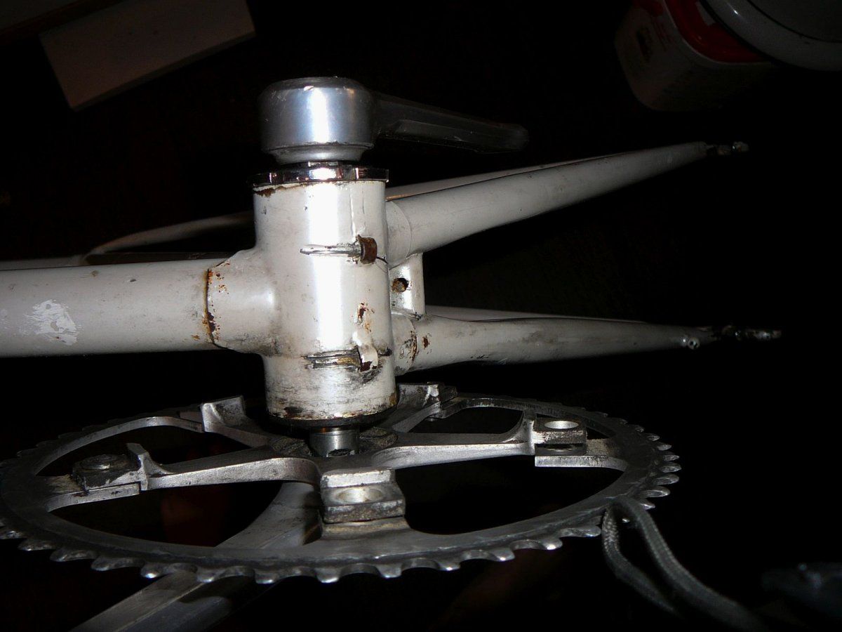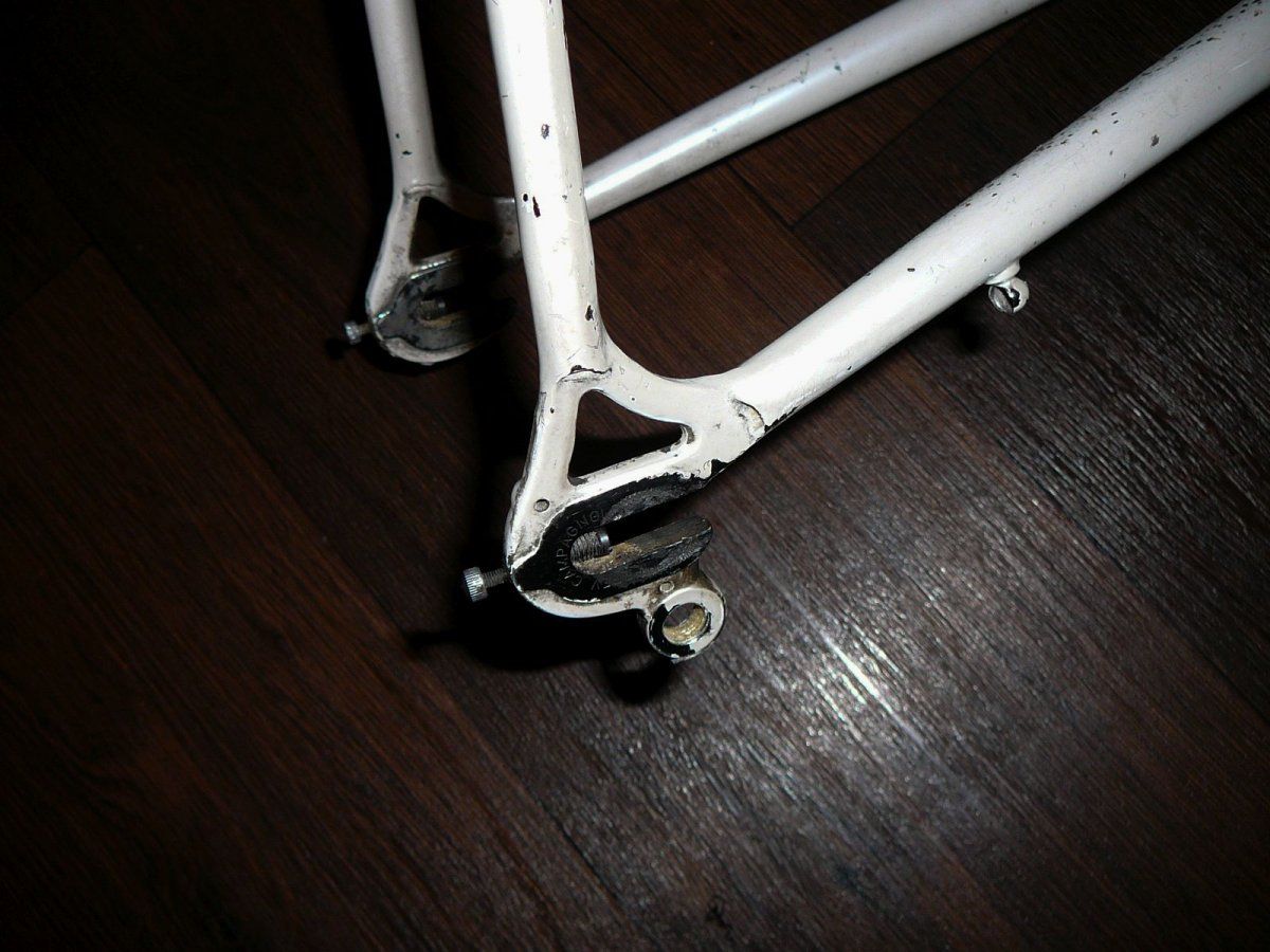 Noch was; Rahmen unbekannter Herkunft. Campa Aufkleber sind Quatsch, Ausfallenden Campa, Muffen schön, Kettenstrebe unterverchromt. Lack Perlmutt; denke ist original.