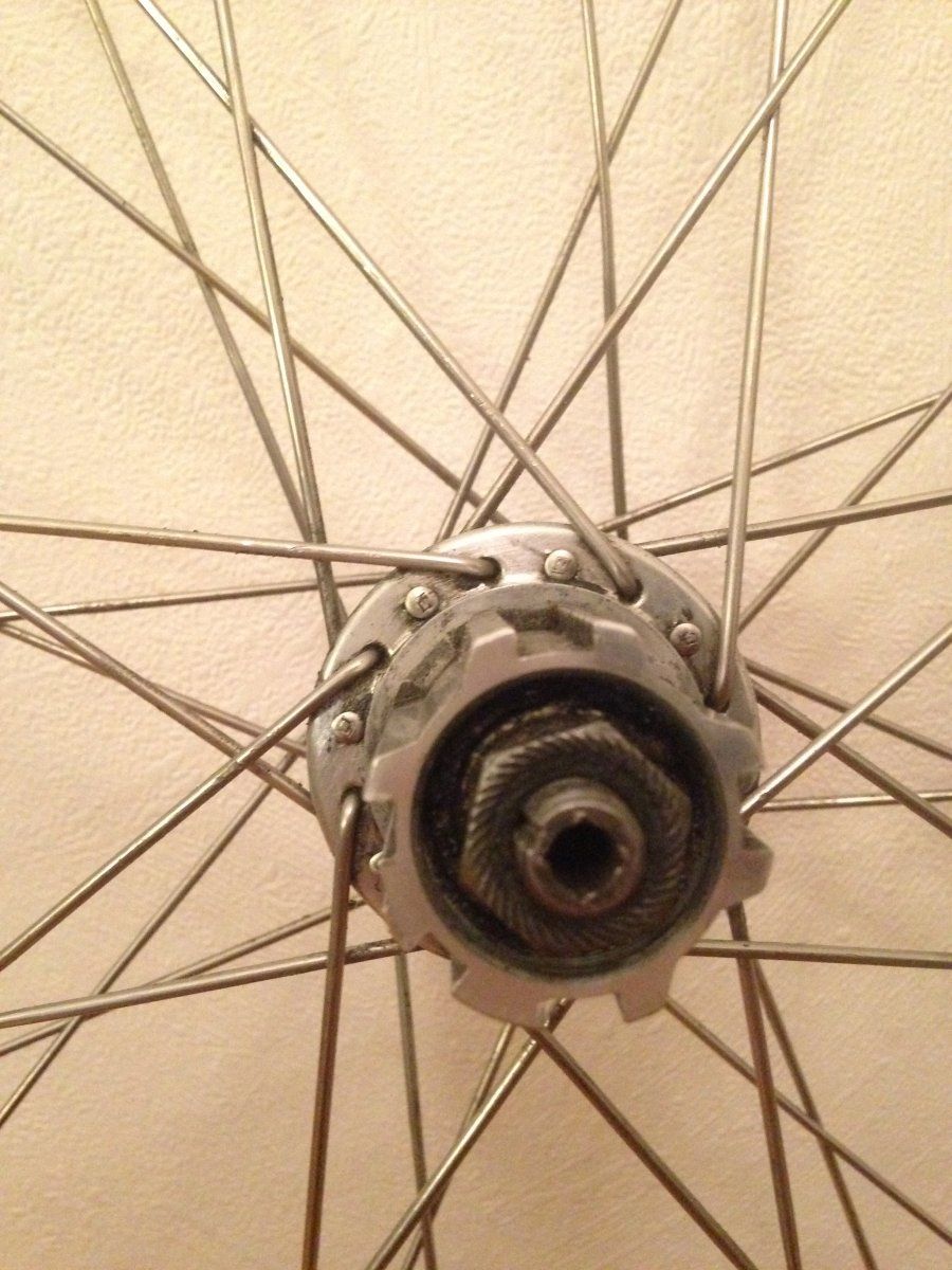 Zu Hause musste ich feststellen, dass die Nabe deutlich breiter baut, als meine anderen Hinterradnaben. Da ursprünglich auch eine Vollachse verbaut war, befürchte ich dass das eine Bahnnabe ist, die sich mit Zahnkranz gar nicht vernünftig nutzen läst. :eek: