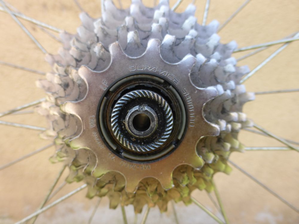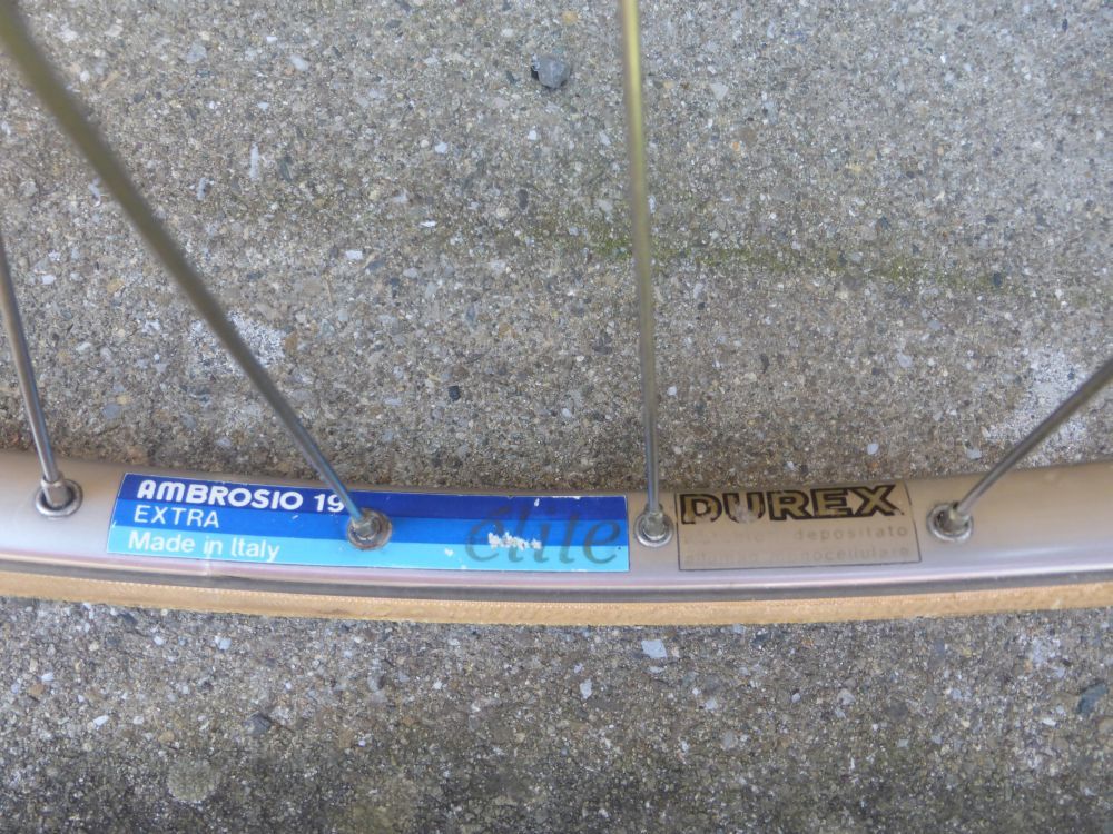 HR ist Campa Record mit ~129mm Einbaubreite (128,7 sagt der Messschieber - da hat wohl mal jemand was gebastelt..) und einem 7fach Dura Ace MF-7400 Schraubkranz in recht solidem Zustand. Ditt sollte noch ein bisschen fahrbar sein. Felge ist auch von Ambrosio, allerdings die 19 Extra Super Elite - vermutlich Durex. Leider sind hier die Aufkleber teilweise entfernt worden. Speichen sind konifiziert (2-1.8-2), links radial gespeicht, rechts 3 fach gekreuzt, SSP (Campa Record) dabei