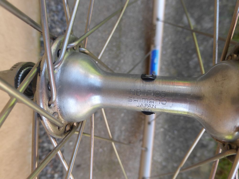 Shimano HB-F105, sollte wohl aus der Golden Arrow Linie stammen, zusammen mit Ambrosio 19 Extra Elite Durex Felge in silber, 3 fach gekreuzt, 2mm Speichen, druff ist ein