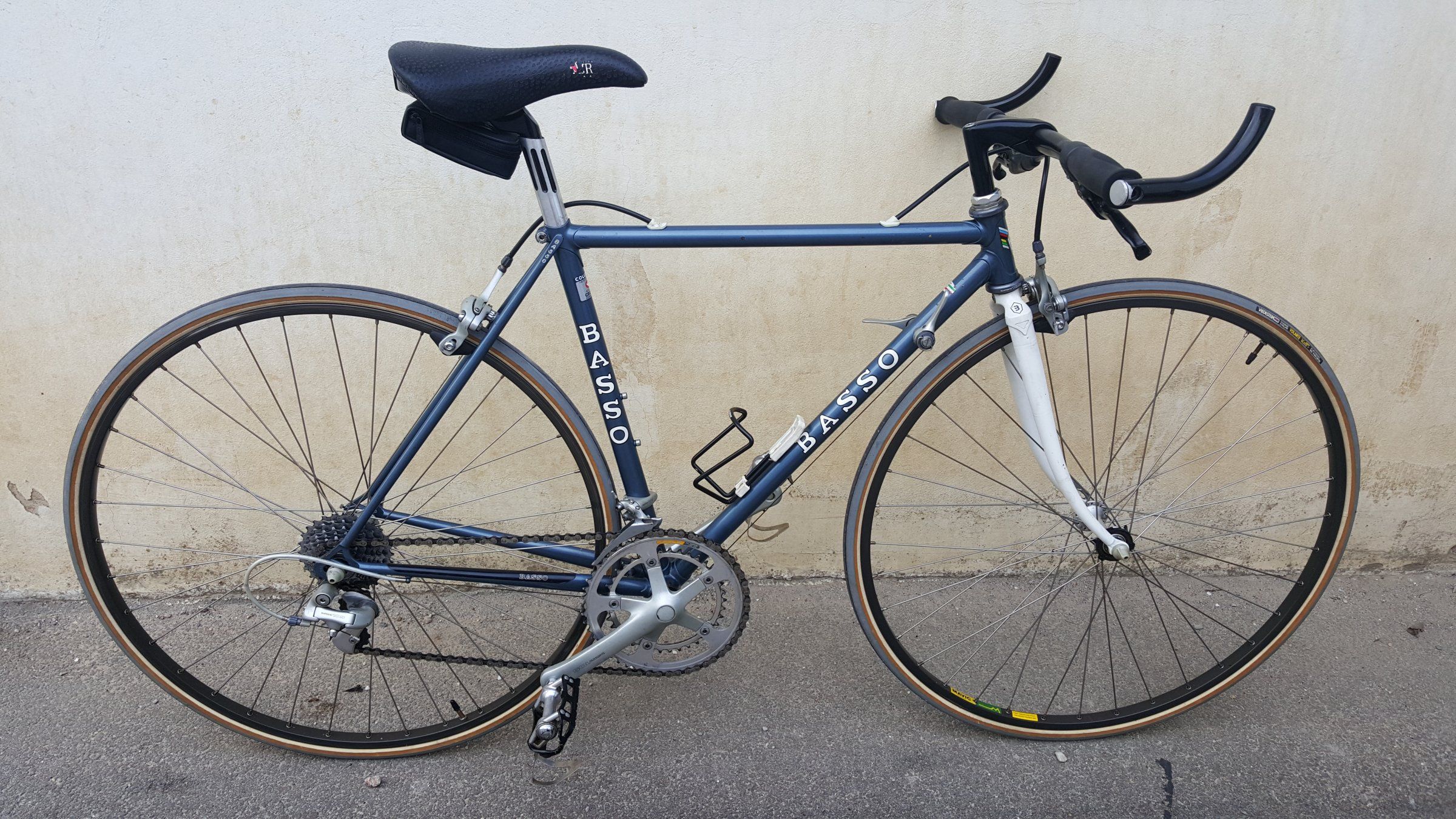 Zustand ist wirklich gut bis sehr gut, alle Decals kleben ohne Macken, der Lack ist prima (bis auf eine Schleifstelle unten am Unterrohr) und die Komponenten haben auch kaum Kampfspuren (sogar die Bremshebel-Gummis sind noch geschmeidig). Obwohl wild gemixt, sieht das Ergebnis -finde ich- ziemlich stimmig aus. (Mit Weisswandreifen sah das noch besser aus, aber da die schon ziemlich bröselig waren, hab ich für die erste Probefahrt auf schwarze Contis gewechselt...). Funktionieren tut das alles einwandfrei, Probefahrt hat auch richtig Spass gemacht.