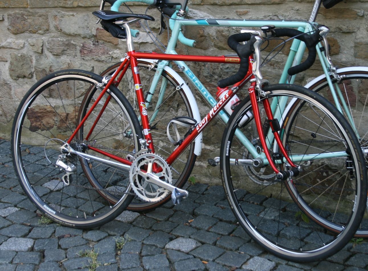 der erste gehört einem guten Kumpel, mit C-Record aufgebaut, sieht schick aus. Der zweite ist noch schicker, bis auf die LR, gehört meiner Frau, die will keinen klassischen LRS. Der große war mal meiner, Magenta/Creme fand ich jetzt nicht soo geil. Dazu war er eigentlich 2 cm zu hoch, sodass ich den Lenker nicht tief genug bekam.alle schön...!