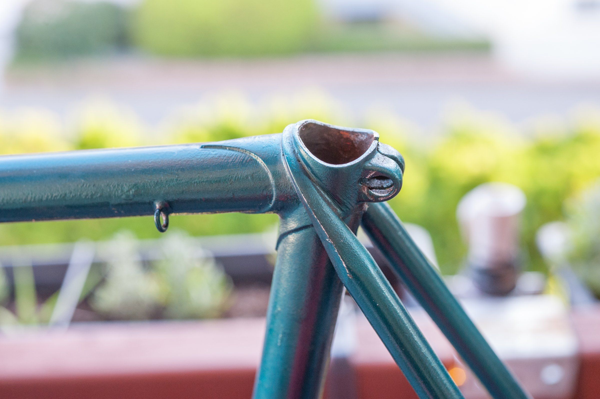 Mein Originallack ist nicht mehr erkennbar, dafür ist die Verarbeitung tadellos. Auch ich habe gebohrte Muffen und ansonsten wenig Schnickschnack. Teilemäßig war ich mit einer TA Cyclotouriste Dreifachkurbel sowie einer kompletten Simplex Schaltung ausgestattet (billiges Delrin an SW und Umwerfer).