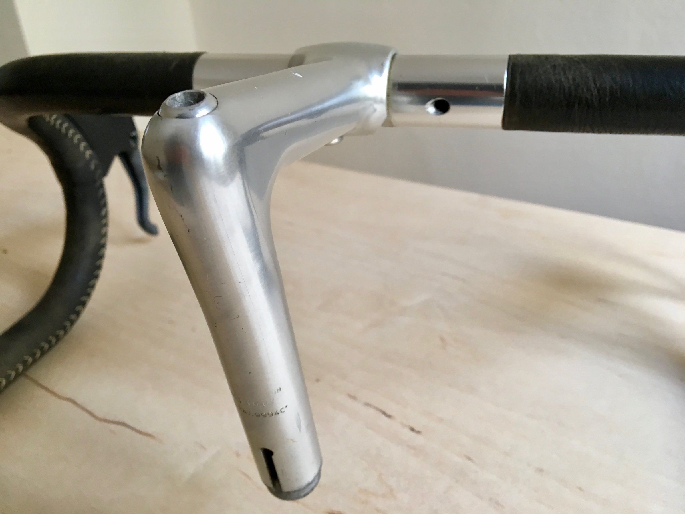 Ich habe hier einen Cinelli 1R Vorbau 120 mm / Cinelli Campione del Mondo Lenker 42 cm den ich schon wegen der Länge nicht gebrauchen kann. Wahrscheinlich wurden die Modolo Bremshebel nachgerüstet + Löcher für die Züge. Und es gibt eine Bohrung an der Unterseite des Vorbaus, die in den Lenker geht (Die Klemmung im Vorbau funktioniert aber einwandfrei).