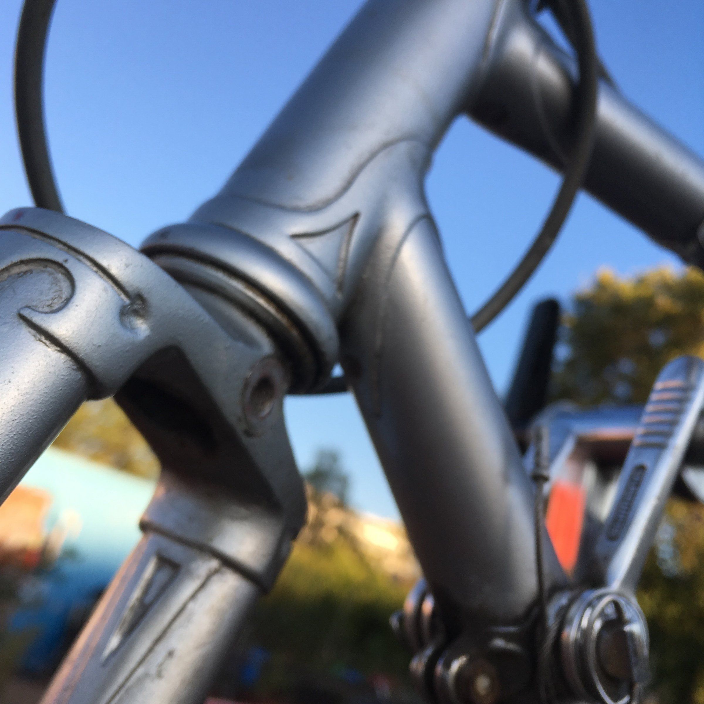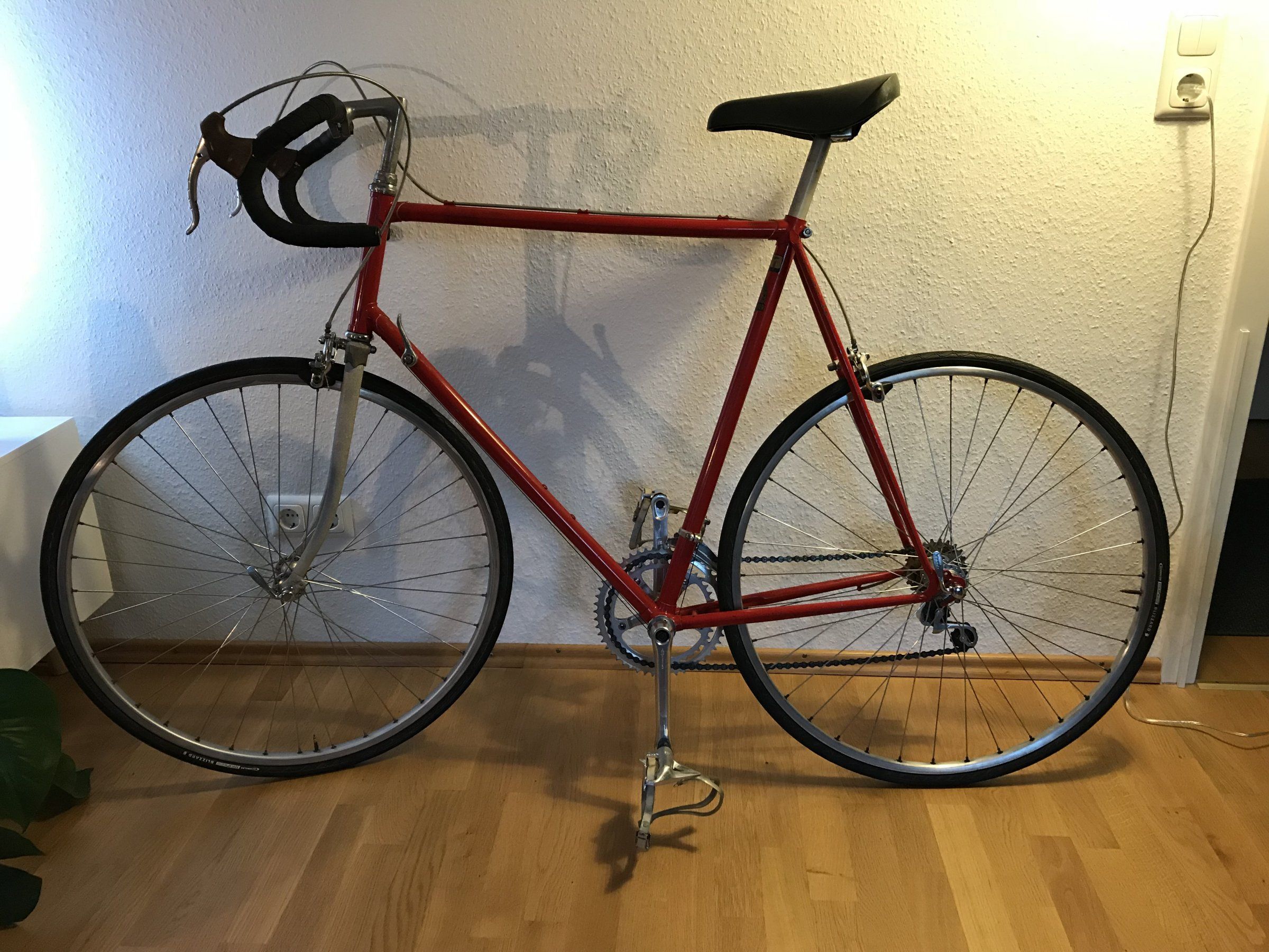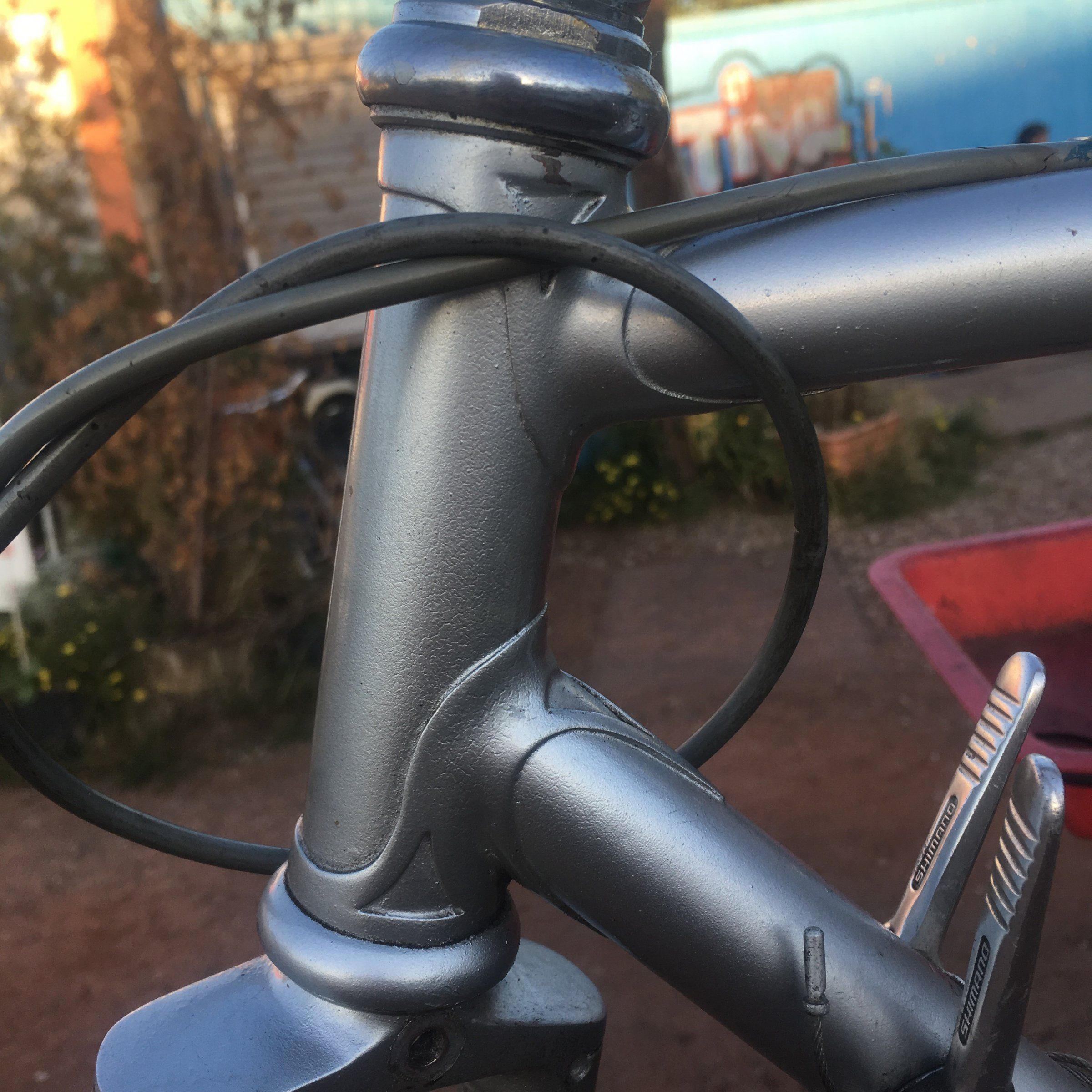 Naja, die Gabel steht schon heftig steil und das Oberrohr steigt an. Dazu ist der Abstand zwischen Reifen und Gabel kleiner als beim Bahnrad. Die Wellen im Rohr kann ich sogar auf dem Bildschirm fühlen.Fällt mir jetzt wie Schuppen von den Augen. Das erklärt auch die seltsamen runden Risse im Lack vorne, das kommt von einem Unfall...