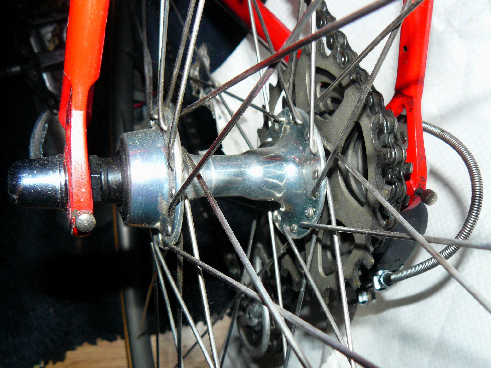 Der Freilauf sieht seltsam aus, eher wie 8fach, auf jeden Fall kein 9fach. Die Ritzel haben jedes einzelne einen eng verzahnten Innenring, als ob es ein Adapter wäre. Die Ritzel sind sehr leicht und filigran, das größte ist aus Alu?