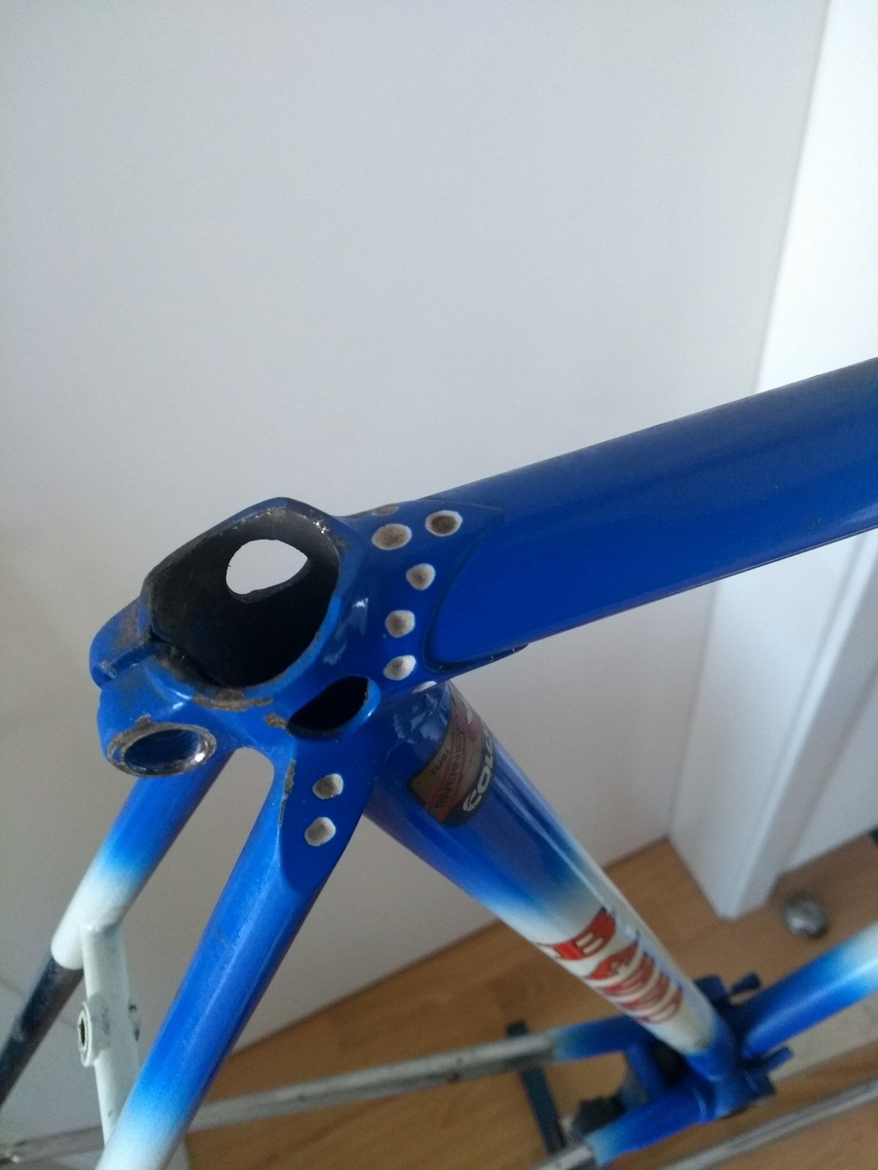 Das könnte gut sein, prima erkannt :-). Da der Columbus Aufkleber ja auf eine Neulackierung hinweist könnte sich da jemand davor noch ausgetobt haben. Somit könnte auch gut die durchbrochene Sitzrohrmuffe bearbeitet sein...