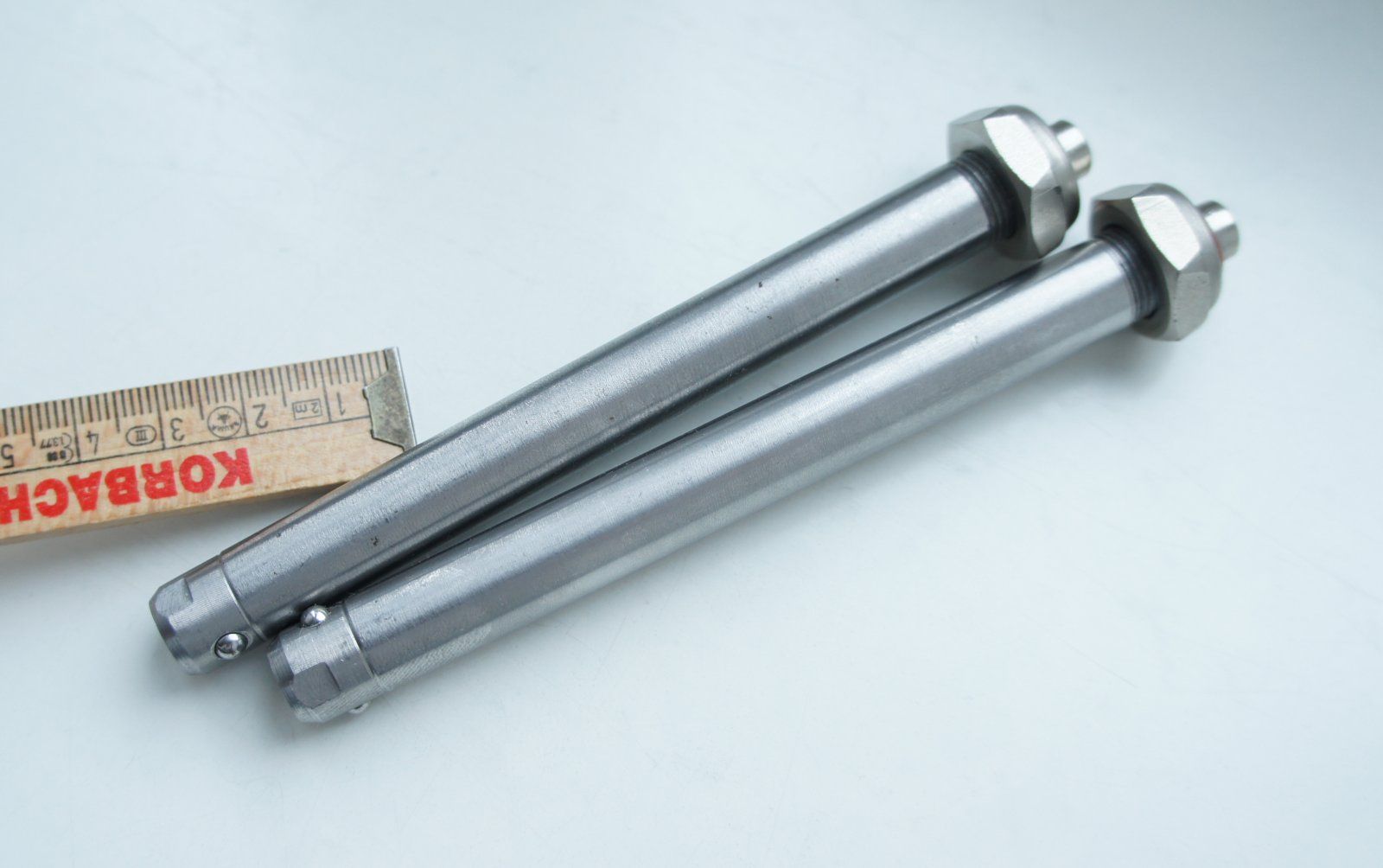 Drückt man den Knopf auf der Seite der Muttern, verschwinden die beiden Kugeln auf der anderen Seite in die Achse.