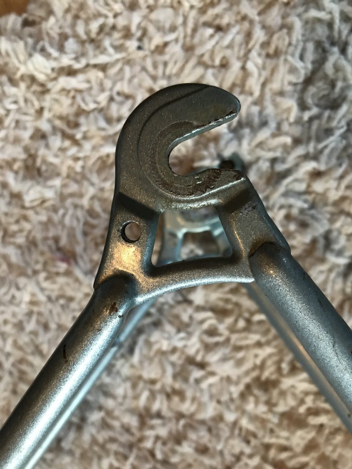 Der Chrom an der Gabel ist noch ganz gut. Einige leichte Roststelle/Lackabplatzer. Innenlager schwergängig, muss wohl getauscht werden.