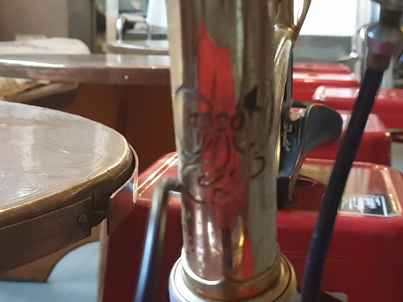 An Hand der Fotos ist er schwer einzuordner, da man, finde ich, nicht wirklich gut sieht, wo das Blattgold jetzt weg ist oder nicht - bis auf die Unterseite des Oberrohres, hier scheint es ja wirklich großflächig zu fehlen. Und ob es wirklich Blattgold ist... hmhm .. I don't know ... vielleicht doch auch nur ein güldener Chromovelato-Lack?